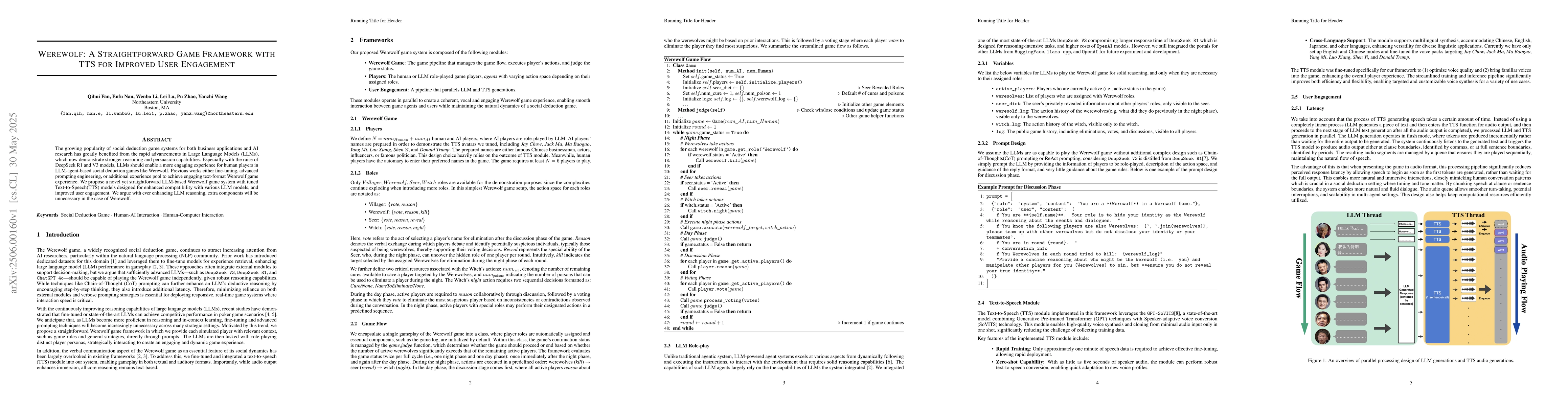 This research is important for advancing social deduction game systems, particularly Werewolf, by utilizing LLMs and TTS to create a more engaging experience for human players in AI research and business applications.