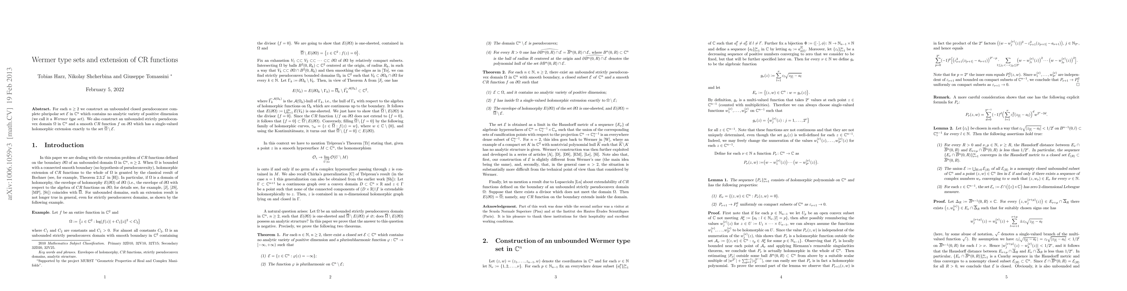 This research constructs Wermer type sets in complex spaces, which are unbounded, closed, pseudoconcave, complete pluripolar sets with no positive dimensional analytic varieties. It also presents an unbounded strictly pseudoconvex domain and a CR function with a unique holomorphic extension to the domain's closure minus the Wermer type set.