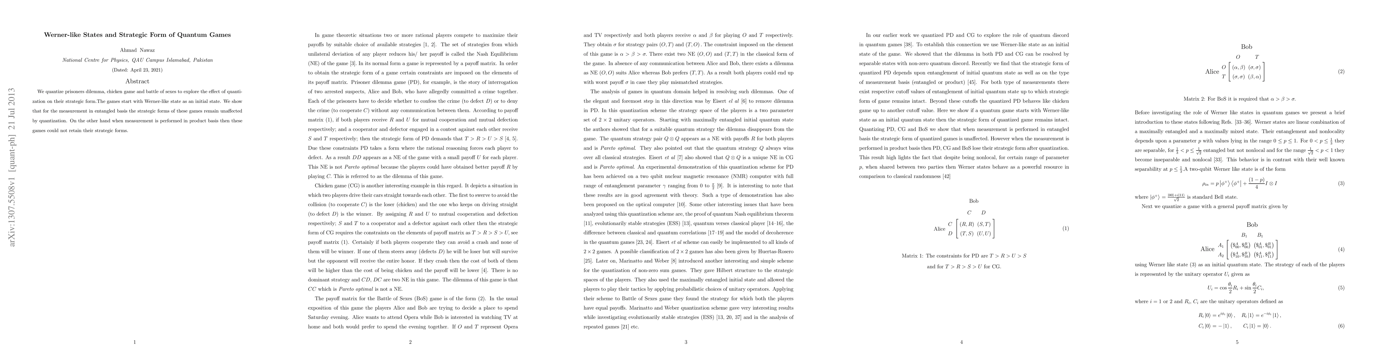 This paper quantizes classical quantum games like the prisoner's dilemma, chicken game, and battle of sexes, starting with a Werner-like state. It finds that measurement in an entangled basis preserves their strategic forms, but measurement in a product basis alters them.