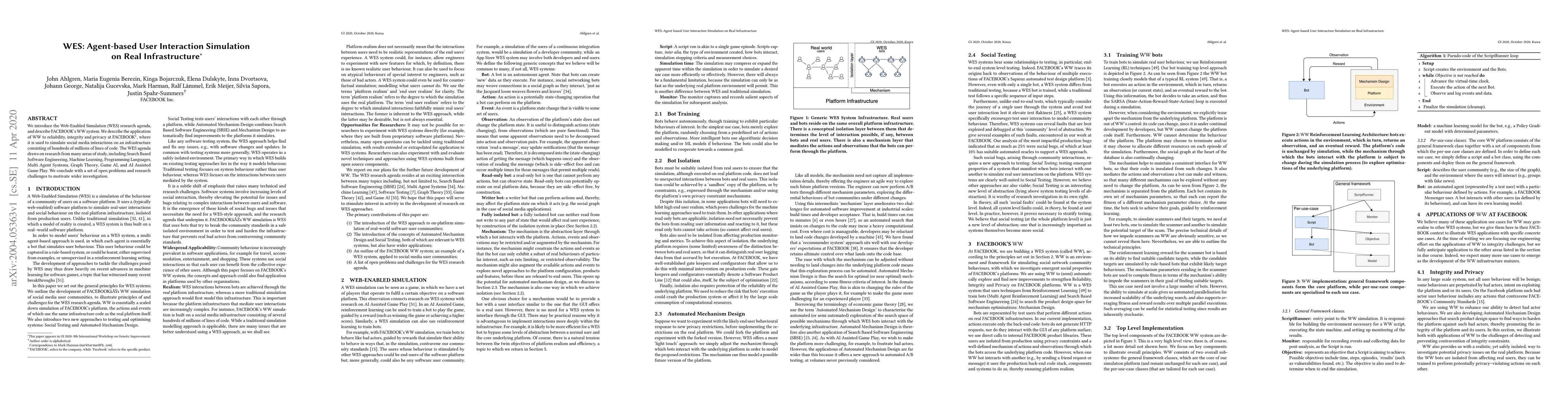We introduce the Web-Enabled Simulation (WES) research agenda, and describe FACEBOOK's WW system. We describe the application of WW to reliability, integrity and privacy at FACEBOOK , where it is used to simulate social media interactions on an infrastructure consisting of hundreds of millions of lines of code. The WES agenda draws on research from many areas of study, including Search Based Software Engineering, Machine Learning, Programming Languages, Multi Agent Systems, Graph Theory, Game AI, and AI Assisted Game Play. We conclude with a set of open problems and research challenges to motivate wider investigation.