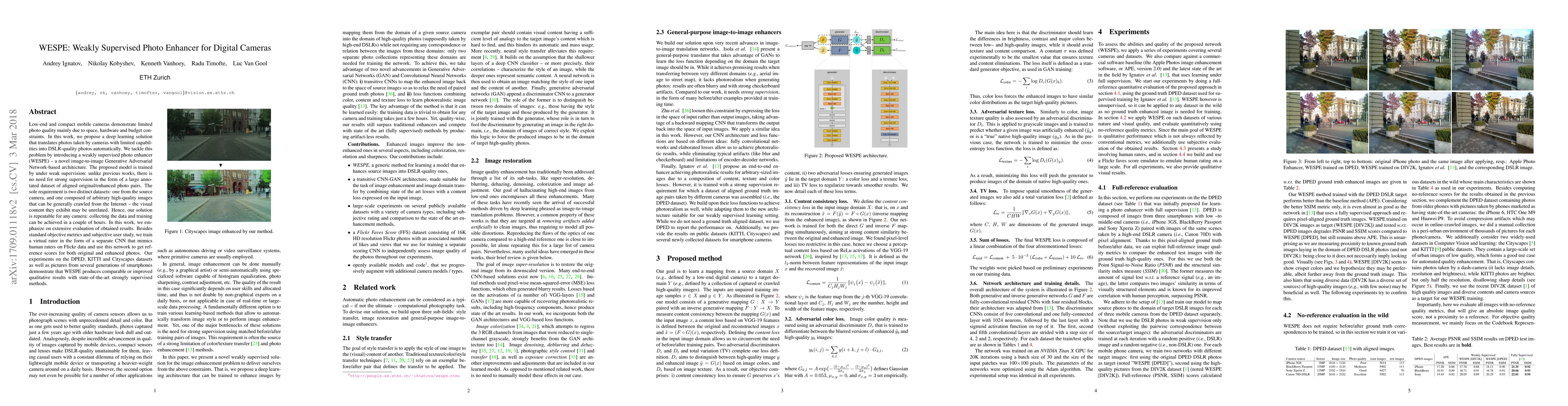 This research introduces WESPE, a weakly supervised Generative Adversarial Network that enhances low-quality photos from budget cameras to DSLR-like quality using only two datasets: one from the source camera and another of arbitrary high-quality images from the internet. Extensive evaluations demonstrate WESPE's competitive performance with strongly supervised methods, offering a quick and repeatable solution for improving camera image quality.