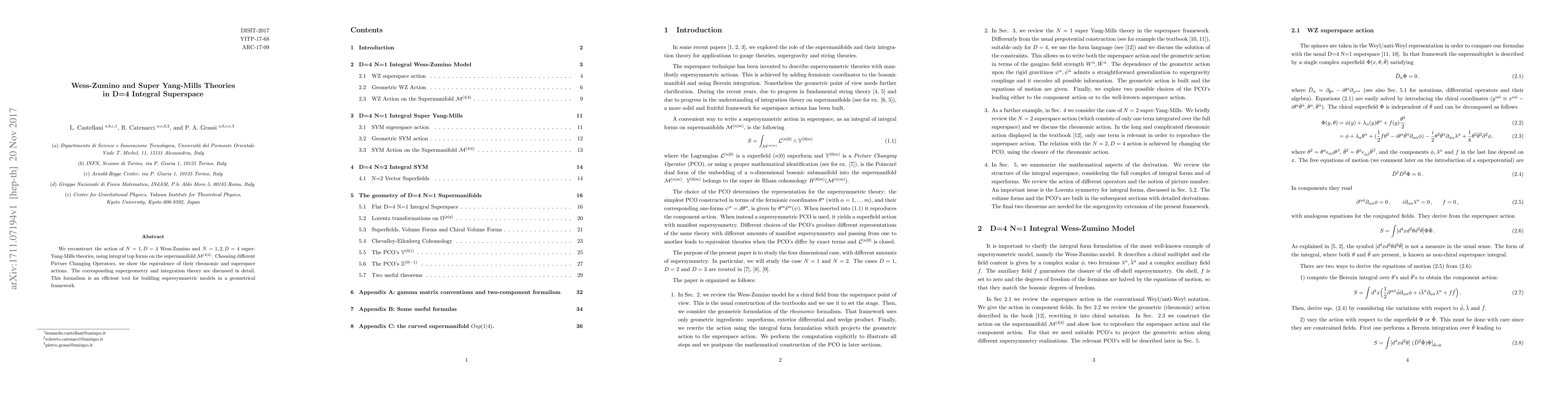 This paper reconstructs the actions for $N=1, D=4$ Wess-Zumino and super-Yang-Mills theories using integral top forms on supermanifolds. It demonstrates the equivalence of rheonomic and superspace actions under various Picture Changing Operators, providing a geometrical framework for supersymmetric models.