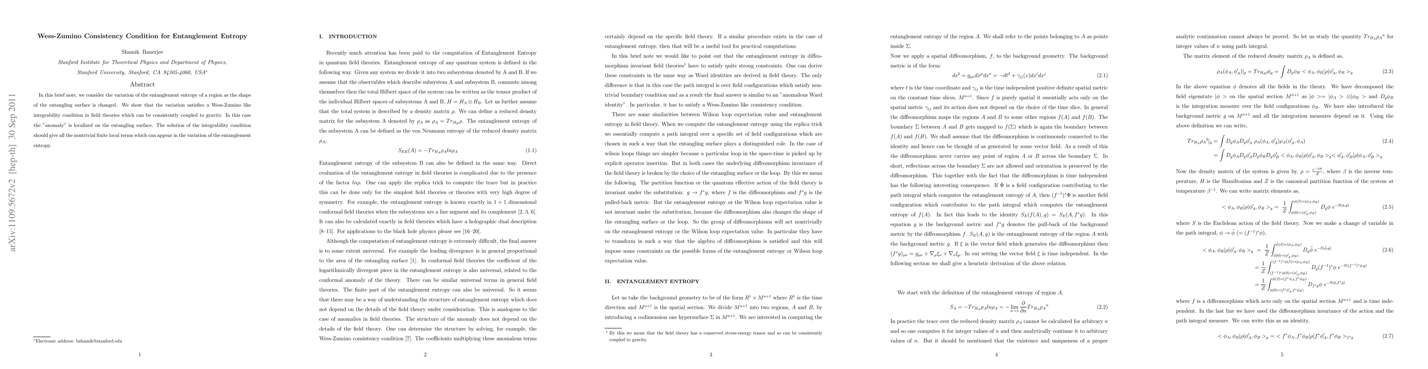 In this brief note, we consider the variation of the entanglement entropy of a region as the shape of the entangling surface is changed. We show that the variation satisfies a Wess-Zumino like integrability condition in field theories which can be consistently coupled to gravity. In this case the "anomaly" is localized on the entangling surface. The solution of the integrability condition should give all the nontrivial finite local terms which can appear in the variation of the entanglement entropy.