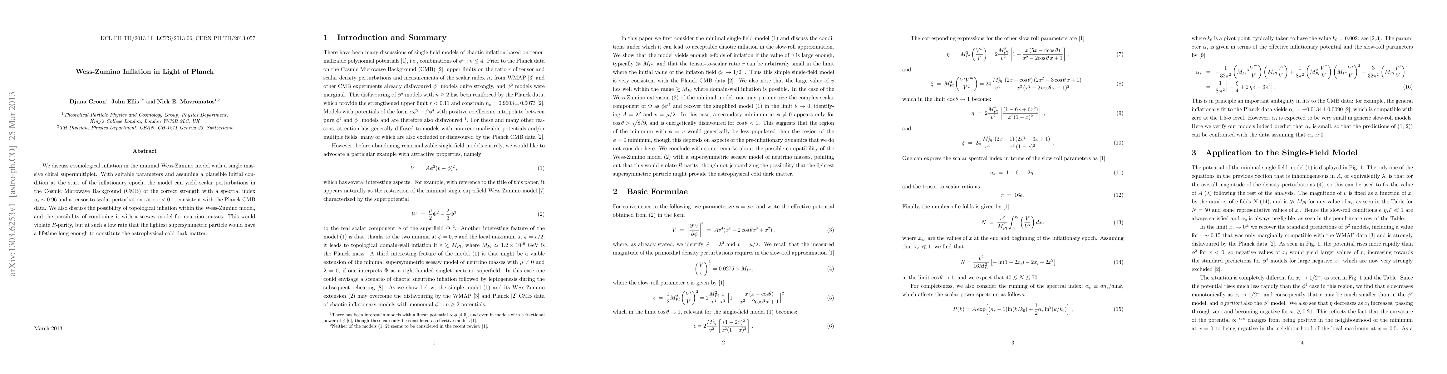 We discuss cosmological inflation in the minimal Wess-Zumino model with a single massive chiral supermultiplet. With suitable parameters and assuming a plausible initial condition at the start of the inflationary epoch, the model can yield scalar perturbations in the Cosmic Microwave Background (CMB) of the correct strength with a spectral index n_s ~ 0.96 and a tensor-to-scalar perturbation ratio r < 0.1, consistent with the Planck CMB data. We also discuss the possibility of topological inflation within the Wess-Zumino model, and the possibility of combining it with a seesaw model for neutrino masses. This would violate R-parity, but at such a low rate that the lightest supersymmetric particle would have a lifetime long enough to constitute the astrophysical cold dark matter.