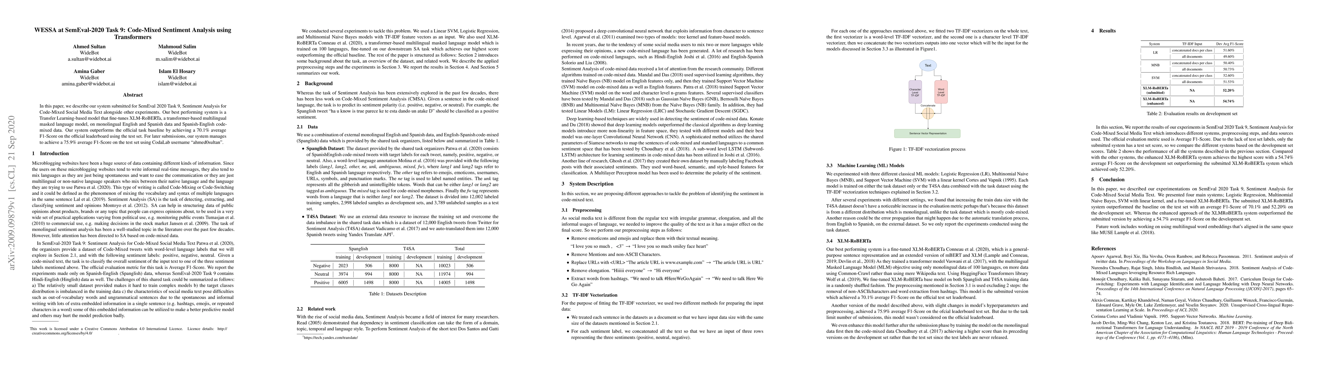 In this paper, we describe our system submitted for SemEval 2020 Task 9, Sentiment Analysis for Code-Mixed Social Media Text alongside other experiments. Our best performing system is a Transfer Learning-based model that fine-tunes "XLM-RoBERTa", a transformer-based multilingual masked language model, on monolingual English and Spanish data and Spanish-English code-mixed data. Our system outperforms the official task baseline by achieving a 70.1% average F1-Score on the official leaderboard using the test set. For later submissions, our system manages to achieve a 75.9% average F1-Score on the test set using CodaLab username "ahmed0sultan".