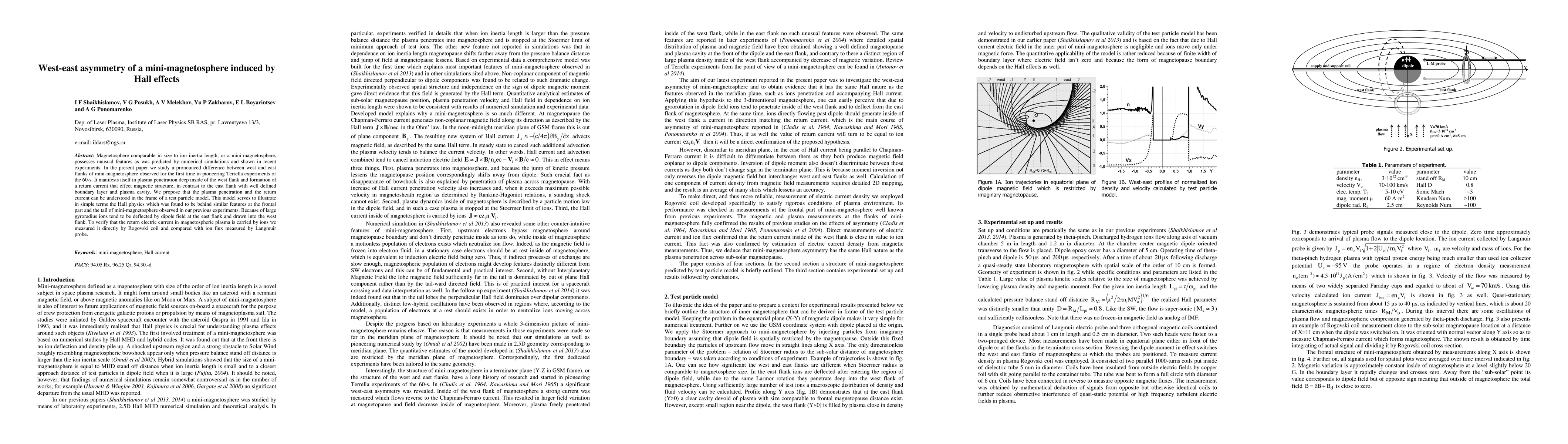 This paper investigates the west-east asymmetry in a mini-magnetosphere, revealing deep plasma penetration and a return current in the west flank, while the east flank exhibits a well-defined boundary layer and plasma cavity. The asymmetry is attributed to Hall effects and verified through direct measurements of return electric current and ion flux.