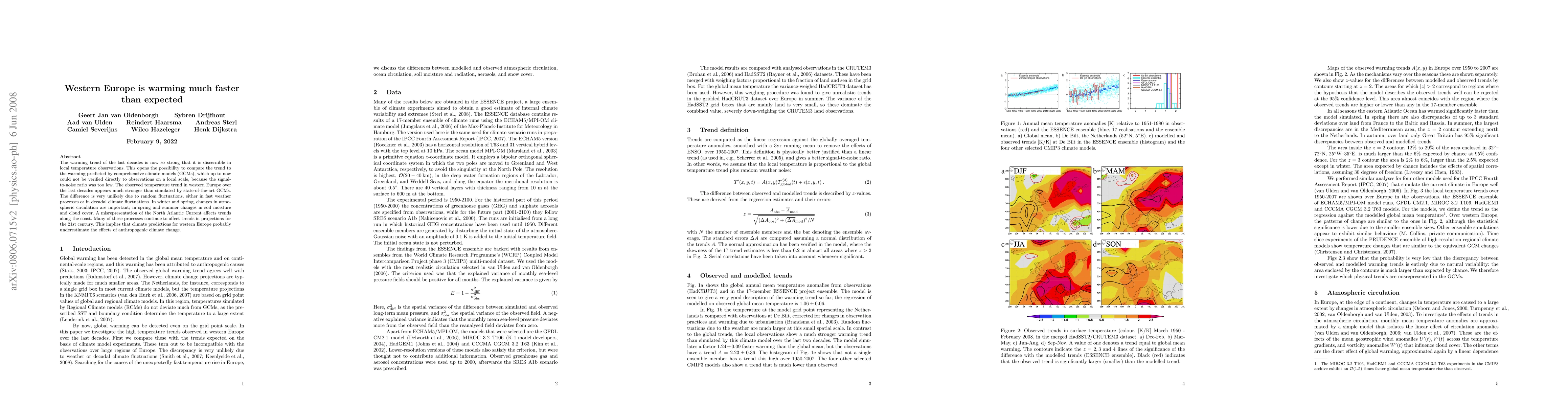 Western Europe has experienced a stronger warming trend than predicted by state-of-the-art climate models, likely due to factors such as atmospheric circulation changes, soil moisture, cloud cover, and misrepresentation of the North Atlantic Current. This suggests current climate projections may underestimate the impacts of anthropogenic climate change.