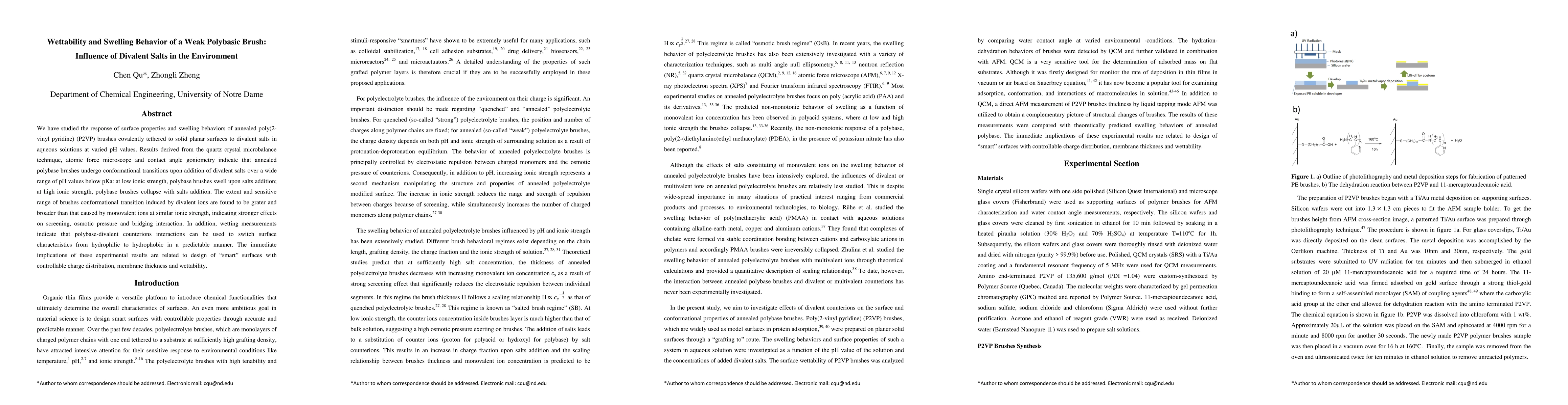 This study investigates the wettability and swelling behavior of annealed poly(2-vinyl pyridine) brushes in response to divalent salts, revealing conformational transitions and surface property changes that can switch hydrophilic to hydrophobic characteristics. The findings suggest potential applications in designing "smart" surfaces with tunable charge and wettability.