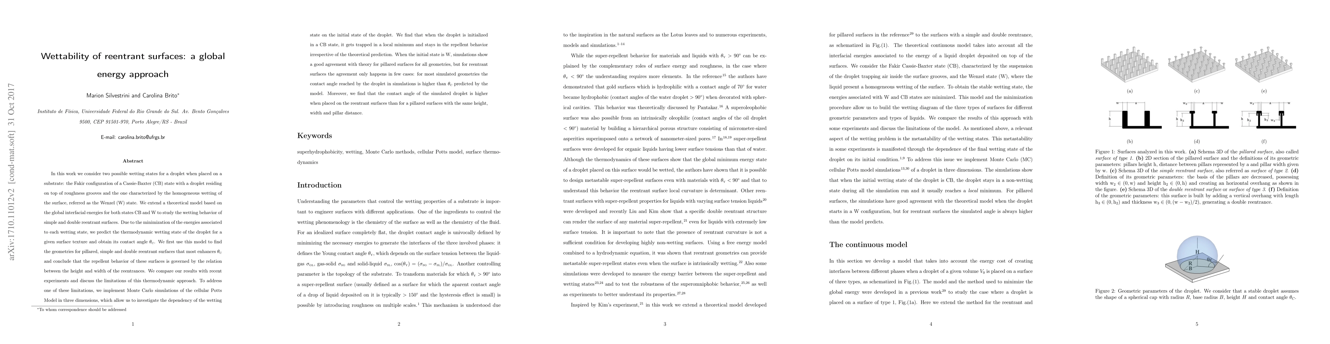 In this work we consider two possible wetting states for a droplet when placed on a substrate: the Fakir configuration of a Cassie-Baxter (CB) state with a droplet residing on top of roughness grooves and the Wenzel (W) state characterized by the homogeneous wetting of the surface. We extend a theoretical model based on the global interfacial energies for both states to study the wetting behavior of simple and double reentrant surfaces. Due to the minimization of the energies associated to each wetting state, we predict the thermodynamic wetting state of the droplet for a given surface and obtain its contact angle ${\theta}_C$. We first use this model to find the geometries for pillared, simple and double reentrant surfaces that most enhances ${\theta}_C$ and conclude that the repellent behavior of these surfaces is governed by the relation between the height and width of the reentrances. We compare our results with recent experiments and discuss the limitations of this thermodynamic approach. To address one of these limitations, we implement Monte Carlo simulations of the cellular Potts Model in three dimensions, allowing us to investigate the dependency of the wetting state on the initial state of the droplet. We find that when the droplet is initialized in a CB state, it gets trapped in a local minimum and stays in the repellent behavior irrespective of the theoretical prediction. When the initial state is W, simulations show a good agreement with theory for pillared surfaces, but for reentrant surfaces the agreement only happens in few cases: for most simulated geometries the contact angle reached by the droplet in simulations is higher than ${\theta}_C$ predicted by the model. Moreover, we find that the contact angle of the simulated droplet is higher when placed on the reentrant surfaces than for a pillared surfaces with the same height, width and pillar distance.