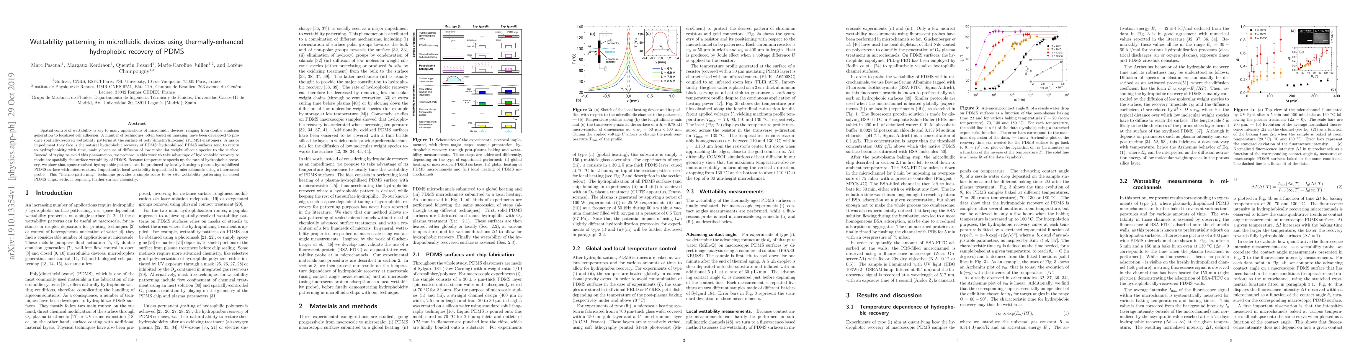 Spatial control of wettability is key to many applications of microfluidic devices, ranging from double emulsion generation to localized cell adhesion. A number of techniques, often based on masking, have been developed to produce spatially-resolved wettability patterns at the surface of poly(dimethylsiloxane) (PDMS) elastomers. A major impediment they face is the natural hydrophobic recovery of PDMS: hydrophilized PDMS surfaces tend to return to hydrophobicity with time, mainly because of diffusion of low molecular weight silicone species to the surface. Instead of trying to avoid this phenomenon, we propose in this work to take advantage of hydrophobic recovery to modulate spatially the surface wettability of PDMS. Because temperature speeds up the rate of hydrophobic recovery, we show that space-resolved hydrophobic patterns can be produced by locally heating a plasma-hydrophilized PDMS surface with microresistors. Importantly, local wettability is quantified in microchannels using a fluorescent probe. This "thermo-patterning" technique provides a simple route to in situ wettability patterning in closed PDMS chips, without requiring further surface chemistry.