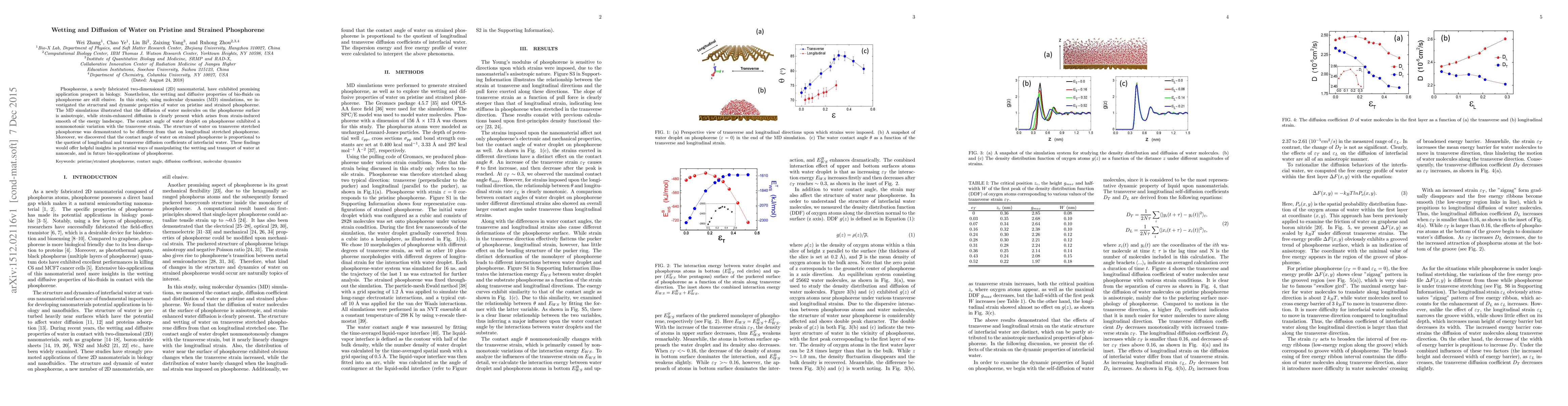 This paper uses molecular dynamics simulations to study the wetting and diffusion of water on pristine and strained phosphorene, revealing anisotropic water diffusion and strain-induced changes in wetting behavior, with the contact angle showing a nonmonotonic response to transverse strain. These insights could guide future bio-applications of phosphorene.