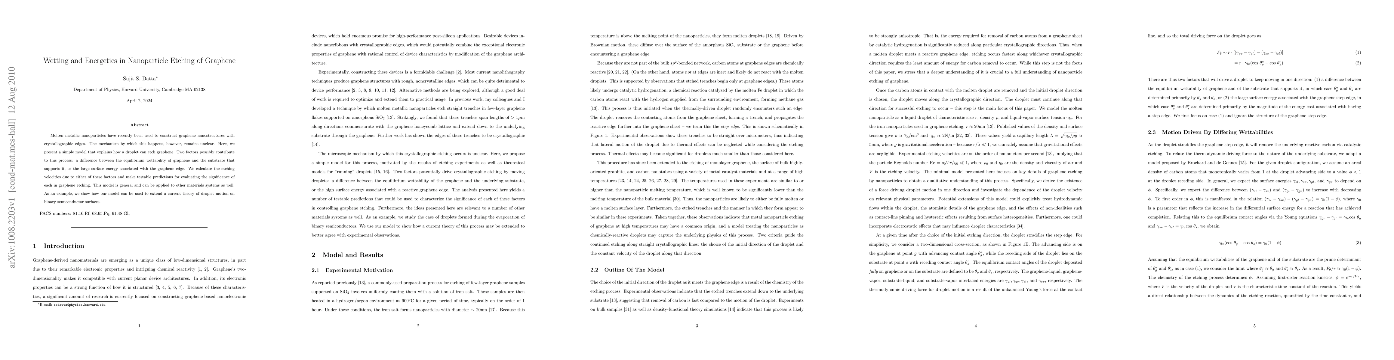 The paper presents a simple model explaining how a molten metallic nanoparticle droplet etches graphene, attributing the process to either a difference in equilibrium wettability between graphene and the supporting substrate or the high surface energy associated with forming a graphene step edge.
