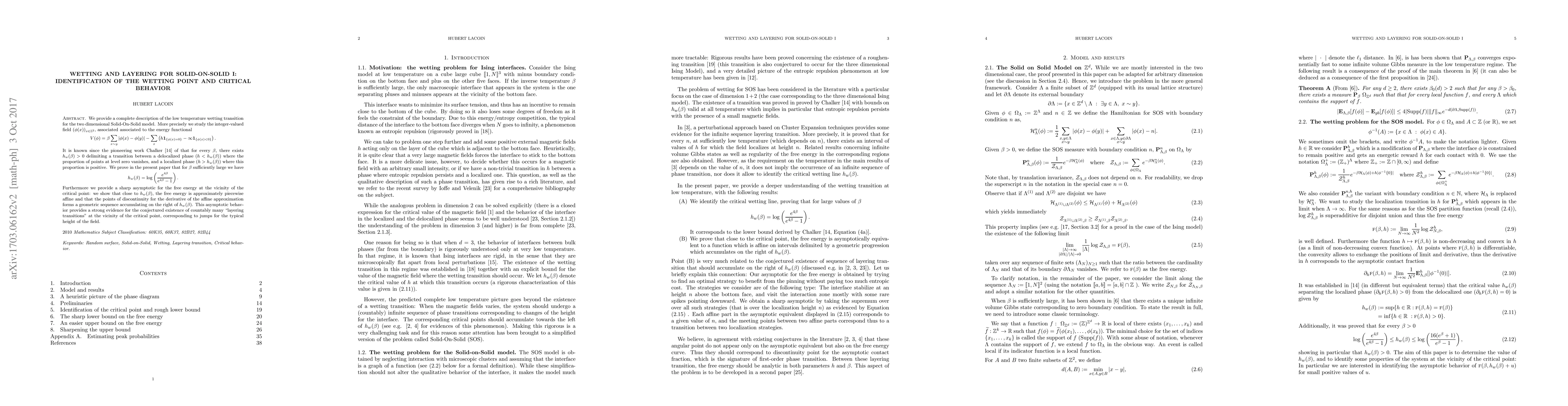 Researchers study the wetting transition in a 2D Solid-On-Solid model, finding that for sufficiently large beta values, the critical wetting point can be approximated as h_w(beta) = log(e^(4*beta)/(e^(4*beta)-1)), and near this point, free energy exhibits piecewise affine behavior with discontinuities accumulating on the right.