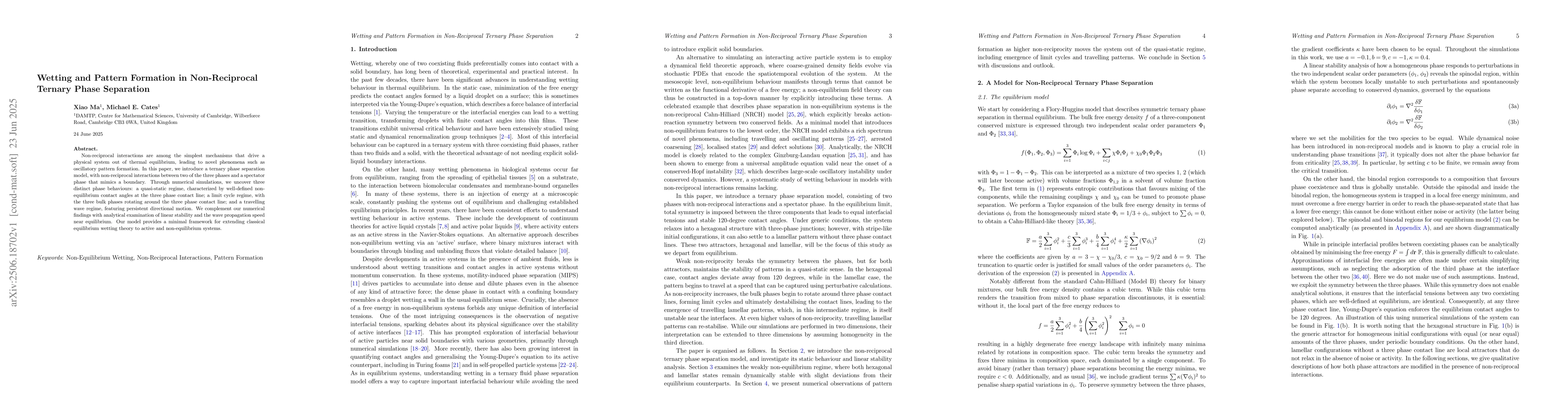 This research presents a ternary phase separation model with non-reciprocal interactions, revealing three distinct phase behaviors: quasi-static with defined contact angles, limit cycle with bulk phase rotation, and travelling wave with directional motion. The study combines numerical simulations and analytical methods, offering a minimal framework to extend equilibrium wetting theory to active, non-equilibrium systems.