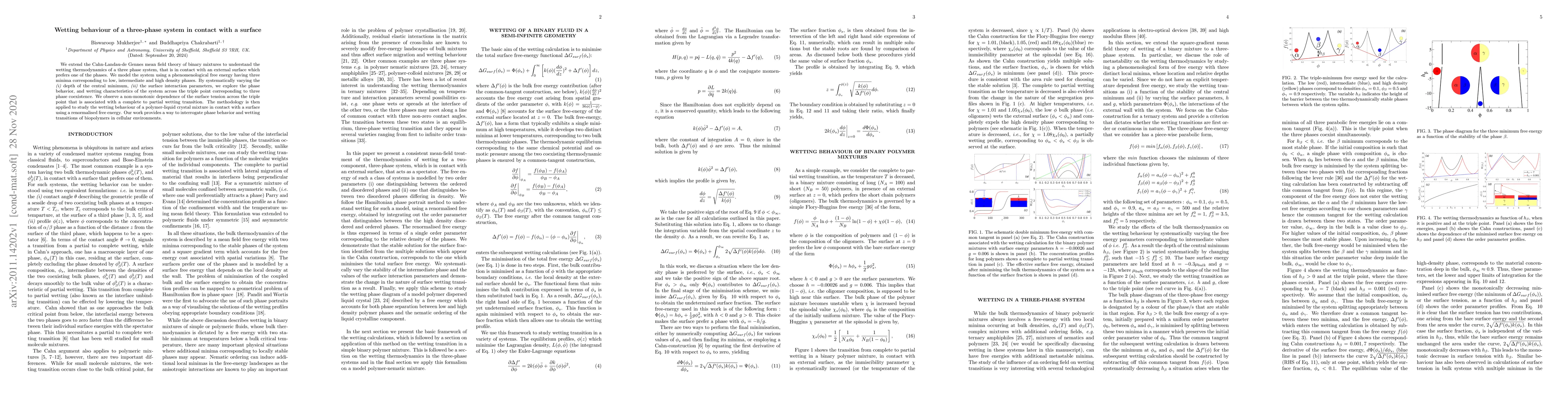 We extend the Cahn-Landau-de Gennes mean field theory of binary mixtures to understand the wetting thermodynamics of a three phase system, that is in contact with an external surface which prefers one of the phases. We model the system using a phenomenological free energy having three minima corresponding to low, intermediate and high density phases. By systematically varying the \textit{(i)} depth of the central minimum, \textit{(ii)} the surface interaction parameters, we explore the phase behavior, and wetting characteristics of the system across the triple point corresponding to three phase coexistence. We observe a non-monotonic dependence of the surface tension across the triple point that is associated with a complete to partial wetting transition. The methodology is then applied to study the wetting behaviour of a polymer-liquid crystal mixture in contact with a surface using a renormalised free energy. Our work provides a way to interrogate phase behavior and wetting transitions of biopolymers in cellular environments.