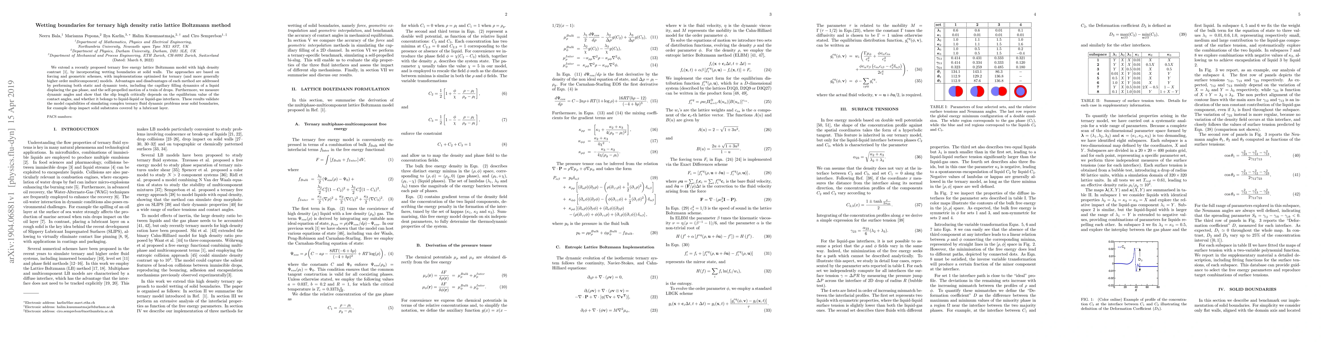 This paper extends a ternary lattice Boltzmann model to include wetting boundaries, evaluating both forcing and geometric schemes for their effectiveness. The study validates the model's ability to simulate complex ternary fluid dynamics, including capillary filling and dynamic angles, demonstrating the critical dependence of slip length on contact angles.