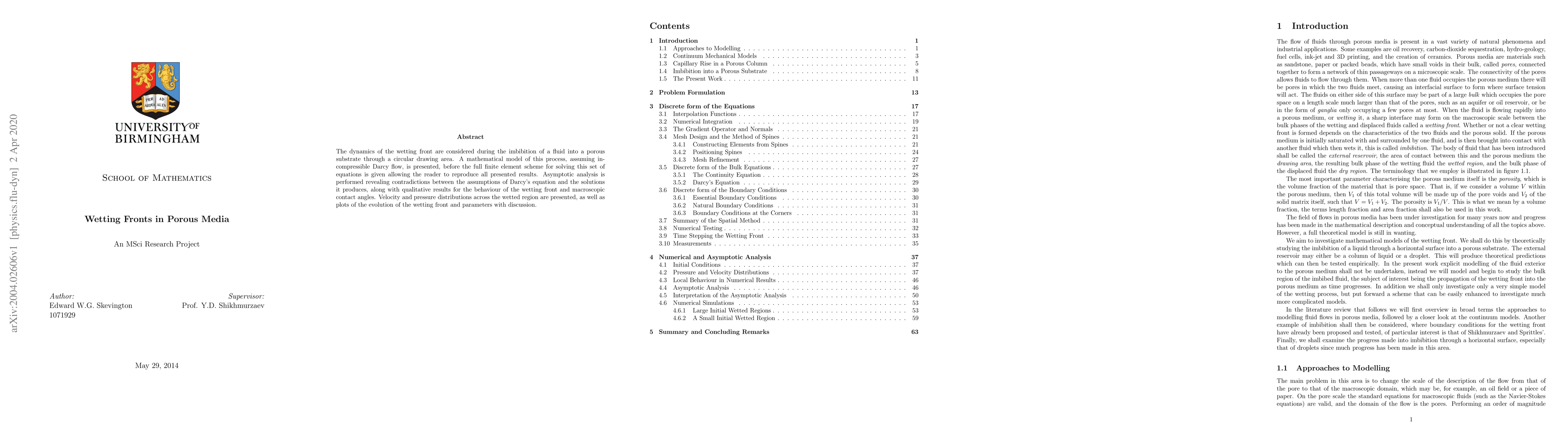 This paper presents a mathematical model for the dynamics of wetting fronts during fluid imbibition in porous media, employing Darcy's law and finite element methods. It reveals discrepancies between Darcy's assumptions and its solutions, and provides detailed analysis of velocity, pressure distributions, and the evolution of the wetting front.