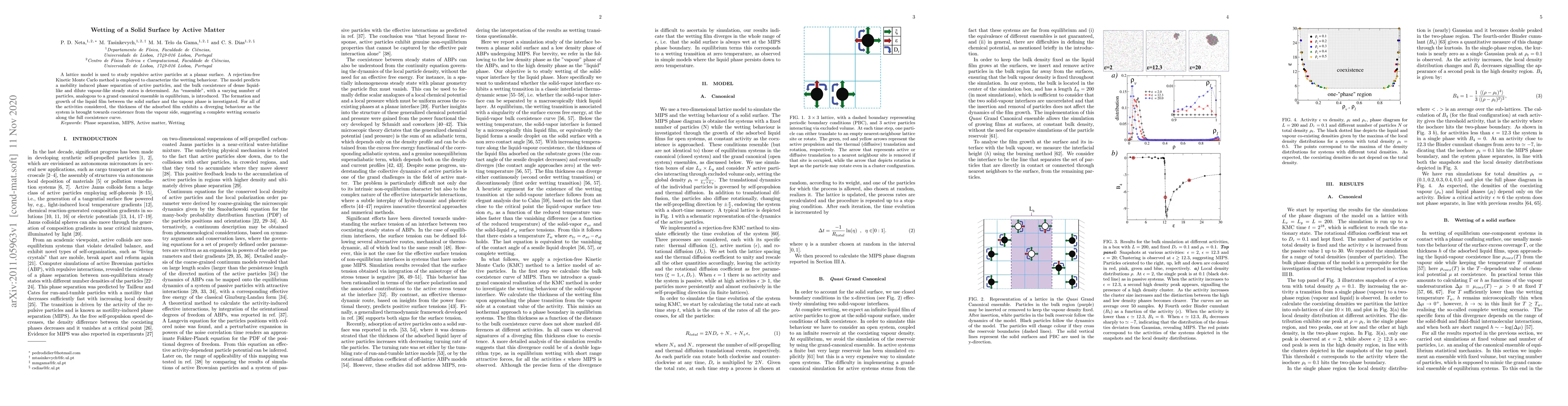 A lattice model is used to study repulsive active particles at a planar surface. A rejection-free Kinetic Monte Carlo method is employed to characterize the wetting behaviour. The model predicts a mobility induced phase separation of active particles, and the bulk coexistence of dense liquid-like and dilute vapour-like steady states is determined. An "ensemble", with a varying number of particles, analogous to a grand canonical ensemble in equilibrium, is introduced. The formation and growth of the liquid film between the solid surface and the vapour phase is investigated. For all of the activities considered, the thickness of the adsorbed film exhibits a diverging behaviour as the system is brought towards coexistence from the vapour side, suggesting a complete wetting scenario along the full coexistence curve.