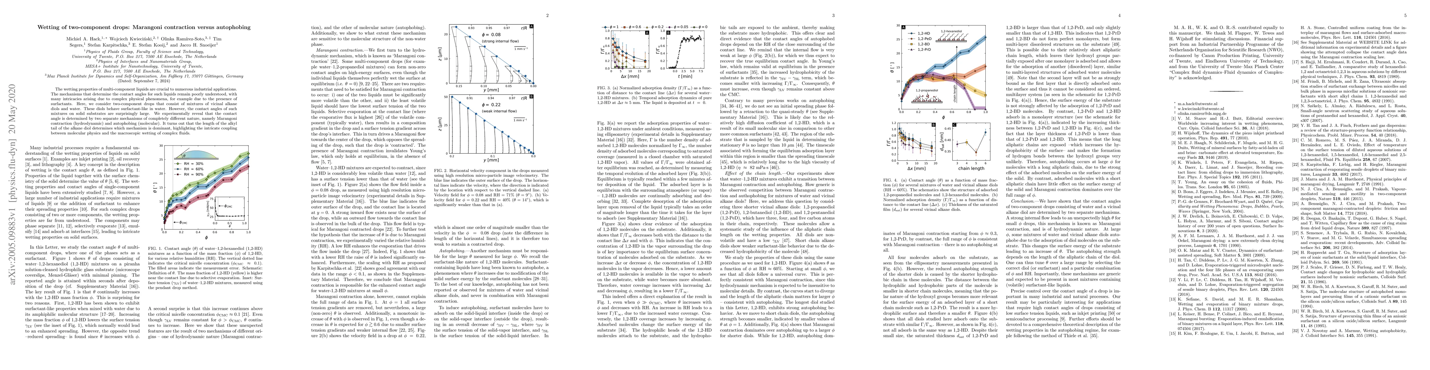 The wetting properties of multi-component liquids are crucial to numerous industrial applications. The mechanisms that determine the contact angles for such liquids remain poorly understood, with many intricacies arising due to complex physical phenomena, for example due to the presence of surfactants. Here, we consider two-component drops that consist of mixtures of vicinal alkane diols and water. These diols behave surfactant-like in water. However, the contact angles of such mixtures on solid substrates are surprisingly large. We experimentally reveal that the contact angle is determined by two separate mechanisms of completely different nature, namely Marangoni contraction (hydrodynamic) and autophobing (molecular). It turns out that the length of the alkyl tail of the alkane diol determines which mechanism is dominant, highlighting the intricate coupling between molecular physics and the macroscopic wetting of complex fluids.