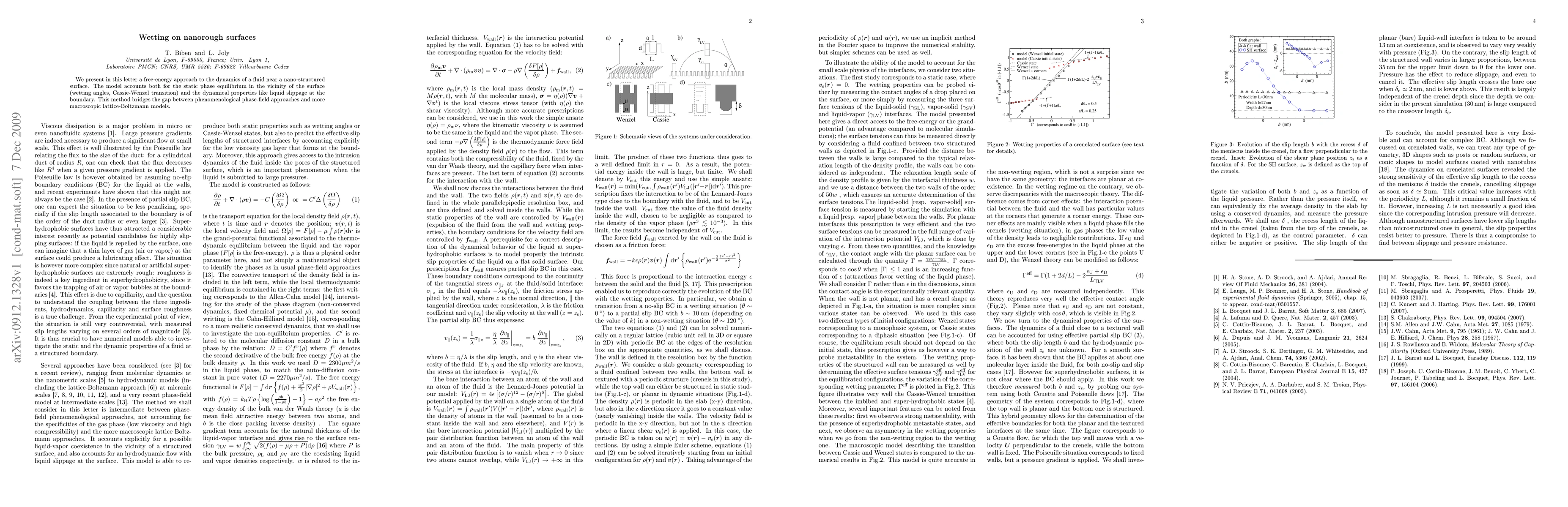 We present in this Letter a free-energy approach to the dynamics of a fluid near a nanostructured surface. The model accounts both for the static phase equilibrium in the vicinity of the surface (wetting angles, Cassie-Wenzel transition) and the dynamical properties like liquid slippage at the boundary. This method bridges the gap between phenomenological phase-field approaches and more macroscopic lattice-Boltzmann models.