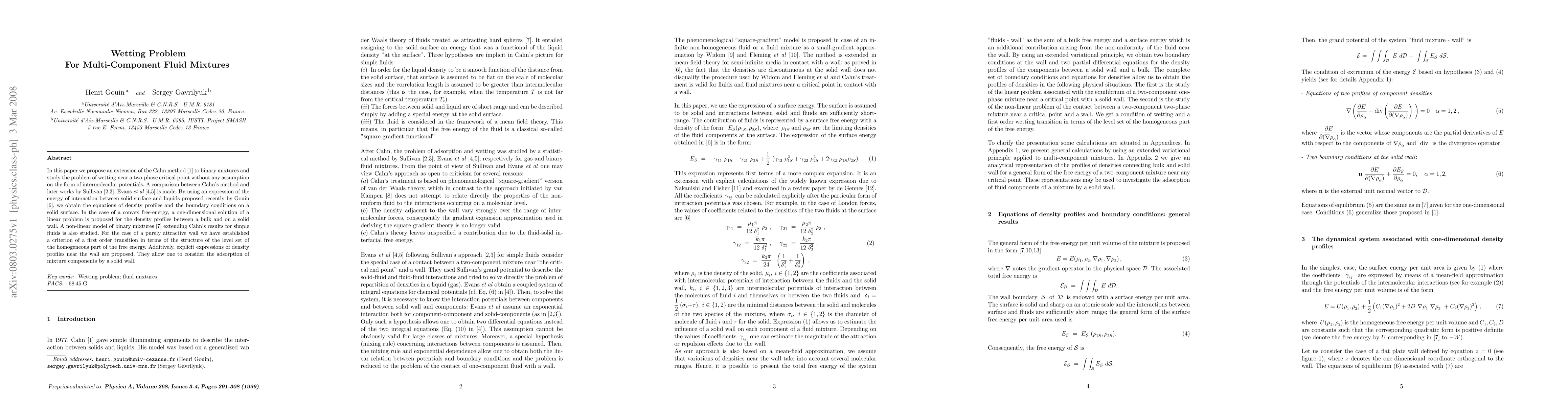In this paper we propose an extension of the Cahn method to binary mixtures and study the problem of wetting near a two-phase critical point without any assumption on the form of intermolecular potentials. A comparison between Cahn's method and later works by Sullivan, Evans et al is made. By using an expression of the energy of interaction between solid surface and liquids proposed recently by Gouin, we obtain the equations of density profiles and the boundary conditions on a solid surface. In the case of a convex free energy, a one-dimensional solution of a linear problem is proposed for the density profiles between a bulk and on a solid wall. A non-linear model of binary mixtures extending Cahn's results for simple fluids is also studied. For the case of a purely attractive wall we have established a criterion of a first order transition in terms of the structure of the level set of the homogeneous part of the free energy. Additively, explicit expressions of density profiles near the wall are proposed. They allow one to consider the adsorption of mixture components by a solid wall.