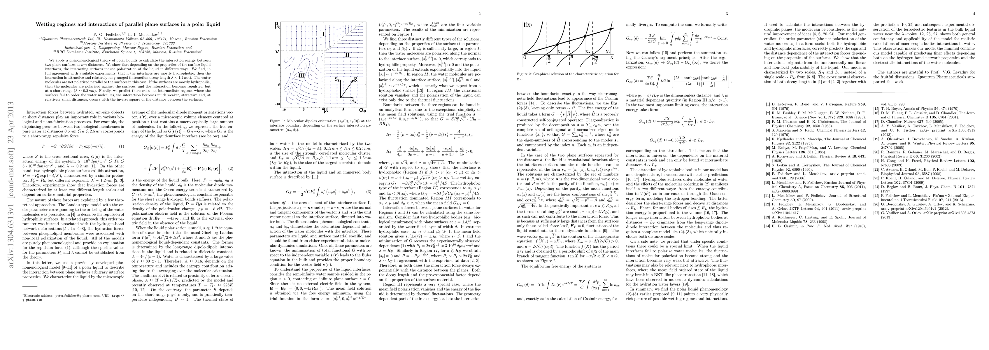 We apply a phenomenological theory of polar liquids to calculate the interaction energy between two plane surfaces at nm-distances. We show that depending on the properties of the surface-liquid interfaces, the interacting surfaces induce polarization of the liquid in different ways. We find, in full agreement with available experiments, that if the interfaces are mostly hydrophobic, then the interaction is attractive and relatively long-ranged (interaction decay length \lambda\sim1.2\, nm). The water molecules are net polarized parallel to the surfaces in this case. If the surfaces are mostly hydrophilic, then the molecules are polarized against the surfaces, and the interaction becomes repulsive, but at a short-range (\lambda\sim0.2\, nm). Finally, we predict there exists an intermediate regime, where the surfaces fail to order the water molecules, the interaction becomes much weaker, attractive and, at relatively small distances, decays with the inverse square of the distance between the surfaces.