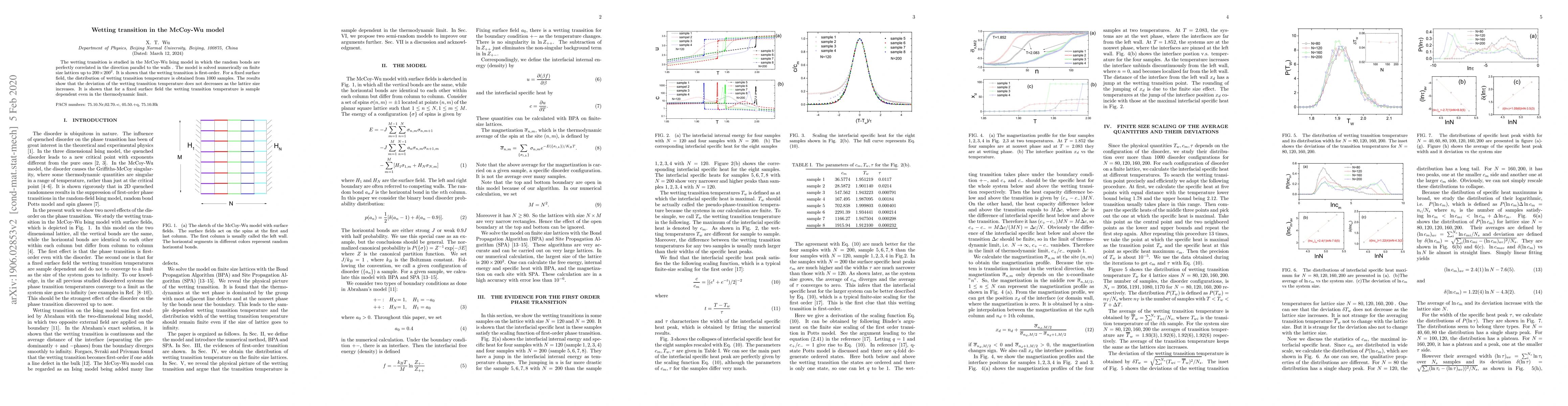The wetting transition is studied in the McCoy-Wu Ising model in which the random bonds are perfectly correlated in the direction parallel to the walls . The model is solved numerically on finite size lattices up to $200 \times 200^2$. It is shown that the wetting transition is first-order. For a fixed surface field, the distribution of wetting transition temperature is obtained from $1000$ samples. The results show that the deviation of the wetting transition temperature does not decreases as the lattice size increases. It is shown that for a fixed surface field the wetting transition temperature is sample dependent even in the thermodynamic limit.