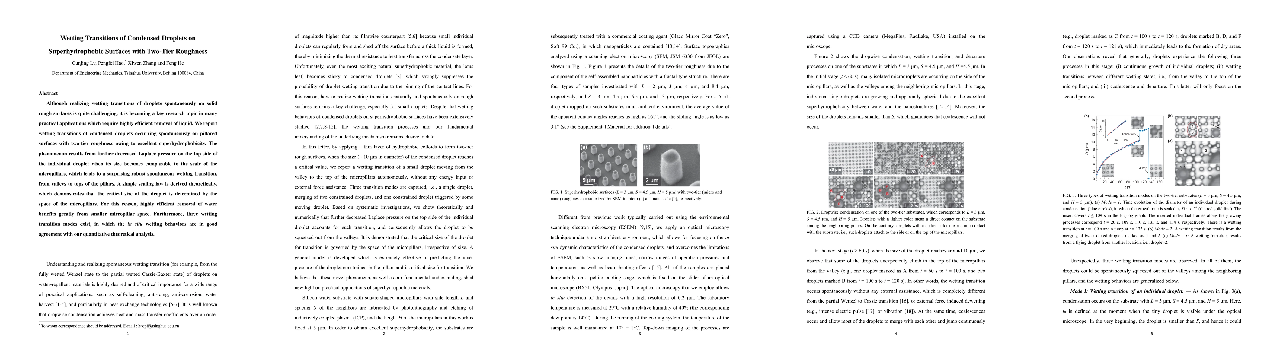 This paper investigates the wetting transitions of condensed droplets on superhydrophobic surfaces with two-tier roughness, showing a robust spontaneous transition from valleys to tops of micropillars due to decreased Laplace pressure. Theoretical scaling laws are derived to determine the critical droplet size, which is influenced by the micropillar space, highlighting the efficiency of water removal with smaller pillar spacing.