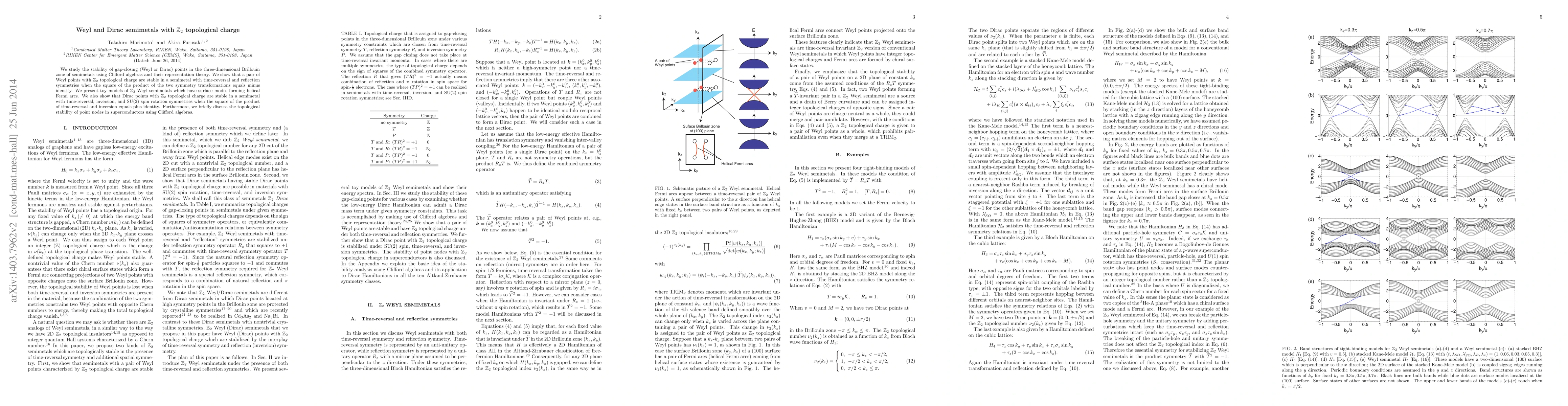 This paper investigates the topological stability of Weyl and Dirac points in semimetals through Clifford algebras, demonstrating that $\mathbb{Z}_2$ topological charge ensures stability for Weyl points under specific symmetry conditions and for Dirac points when certain symmetry transformations are squared to equal plus or minus identity. Toy models reveal helical Fermi arcs on the surface of $\mathbb{Z}_2$ Weyl semimetals.