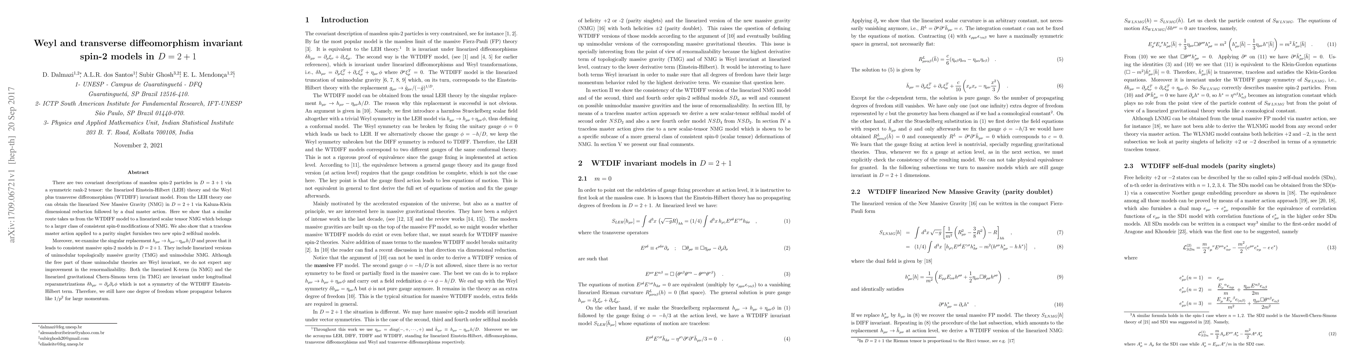 There are two covariant descriptions of massless spin-2 particles in $D=3+1$ via a symmetric rank-2 tensor: the linearized Einstein-Hilbert (LEH) theory and the Weyl plus transverse diffeomorphism (WTDIFF) invariant model. From the LEH theory one can obtain the linearized New Massive Gravity (NMG) in $D=2+1$ via Kaluza-Klein dimensional reduction followed by a dual master action. Here we show that a similar route takes us from the WTDIFF model to a linearized scalar tensor NMG which belongs to a larger class of consistent spin-0 modifications of NMG. We also show that a traceless master action applied to a parity singlet furnishes two new spin-2 selfdual models. Moreover, we examine the singular replacement $h_{\mu\nu} \to h_{\mu\nu} - \eta_{\mu\nu}h/D$ and prove that it leads to consistent massive spin-2 models in $D=2+1$. They include linearized versions of unimodular topologically massive gravity (TMG) and unimodular NMG. Although the free part of those unimodular theories are Weyl invariant, we do not expect any improvement in the renormalizability. Both the linearized K-term (in NMG) and the linearized gravitational Chern-Simons term (in TMG) are invariant under longitudinal reparametrizations $\delta h_{\mu\nu} = \p_{\mu}\p_{\nu}\zeta$ which is not a symmetry of the WTDIFF Einstein-Hilbert term. Therefore, we still have one degree of freedom whose propagator behaves like $1/p^2$ for large momentum.