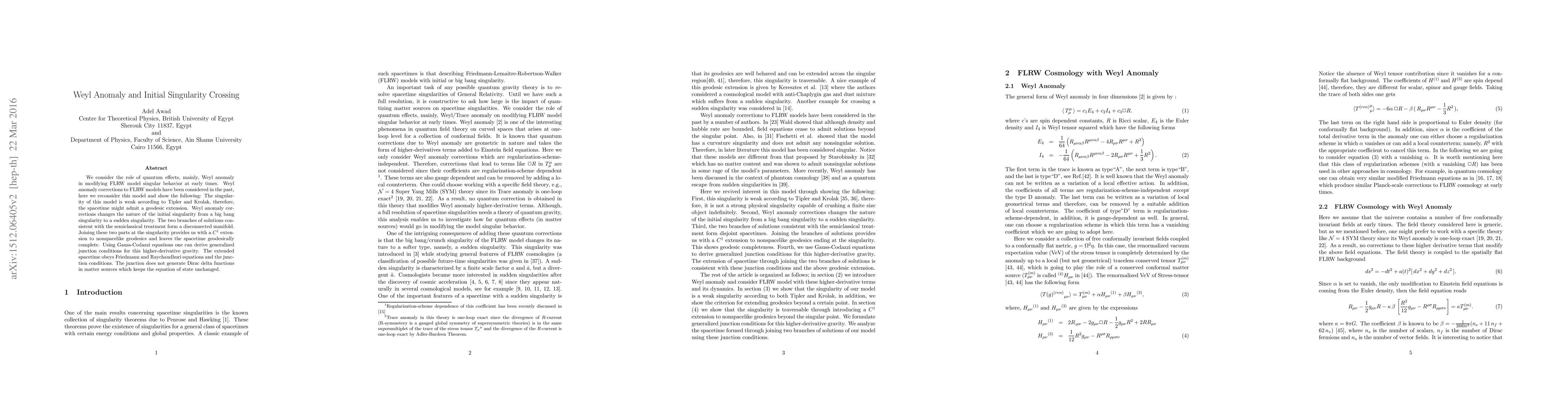 This paper examines how Weyl anomaly corrections modify the FLRW model's initial singularity, transforming it from a big bang singularity to a sudden singularity. The spacetime can be geodesically extended, maintaining geodesic completeness and obeying Friedmann and Raychaudhuri equations, without altering the equation of state.