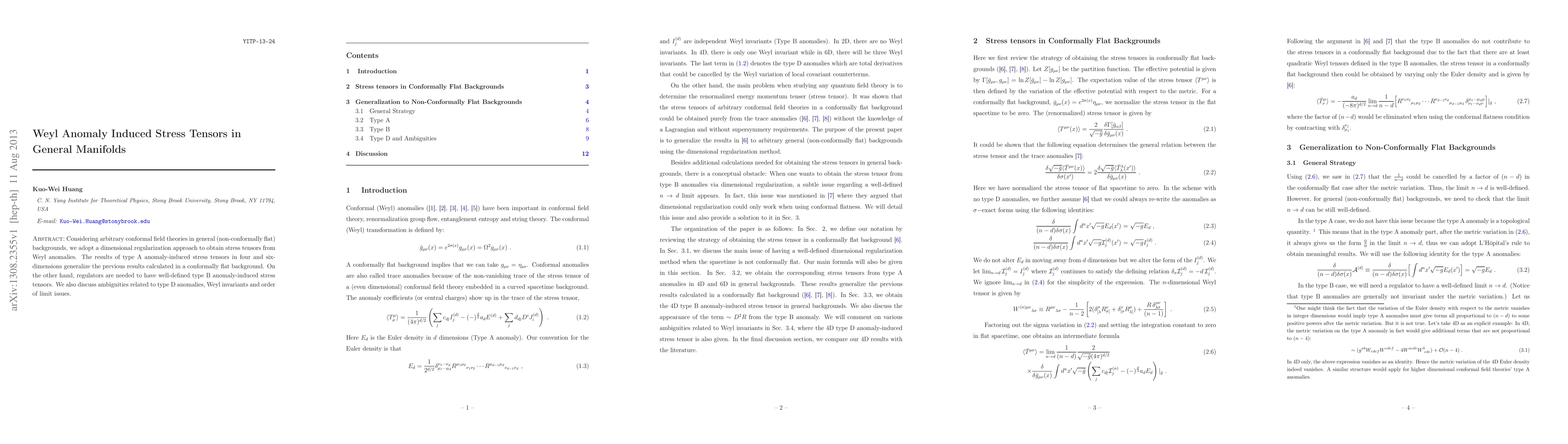 Considering arbitrary conformal field theories in general (non-conformally flat) backgrounds, we adopt a dimensional regularization approach to obtain stress tensors from Weyl anomalies. The results of type A anomaly-induced stress tensors in four and six-dimensions generalize the previous results calculated in a conformally flat background. On the other hand, regulators are needed to have well-defined type B anomaly-induced stress tensors. We also discuss ambiguities related to type D anomalies, Weyl invariants and order of limit issues.