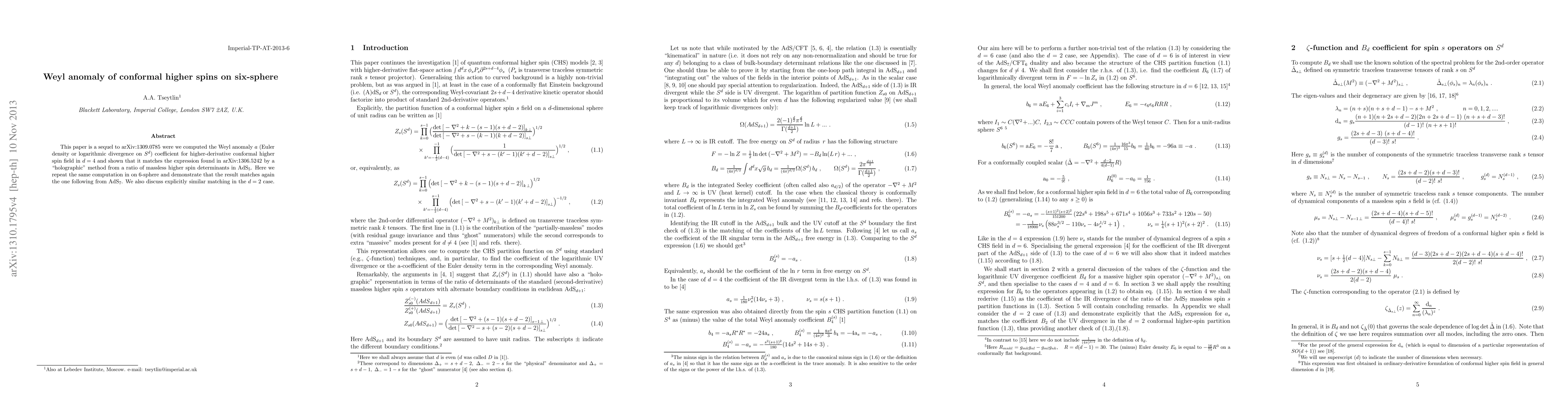This paper computes the Weyl anomaly for conformal higher spin fields on a six-sphere, confirming that the results match those derived from AdS_7 holographic methods, and extends the findings to the d=2 case. The study builds on previous work in four dimensions and aligns with results from arXiv:1306.5242.