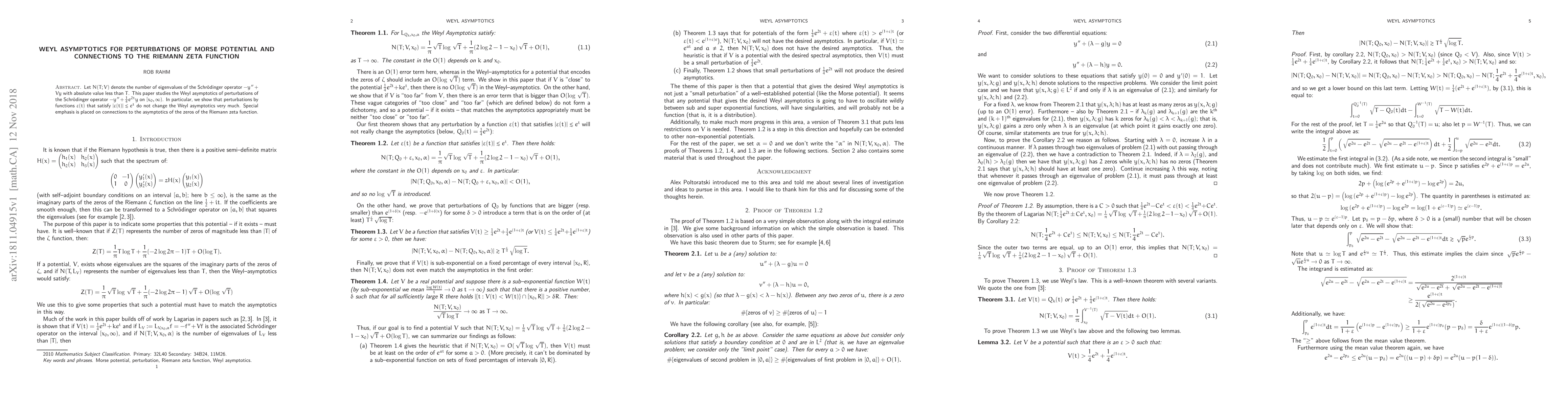 This paper investigates the Weyl asymptotics for perturbations of a Morse potential in the Schrödinger operator, demonstrating that small perturbations do not significantly alter the asymptotic behavior. It also explores connections between the eigenvalue distribution of the perturbed operator and the asymptotics of the zeros of the Riemann zeta function.