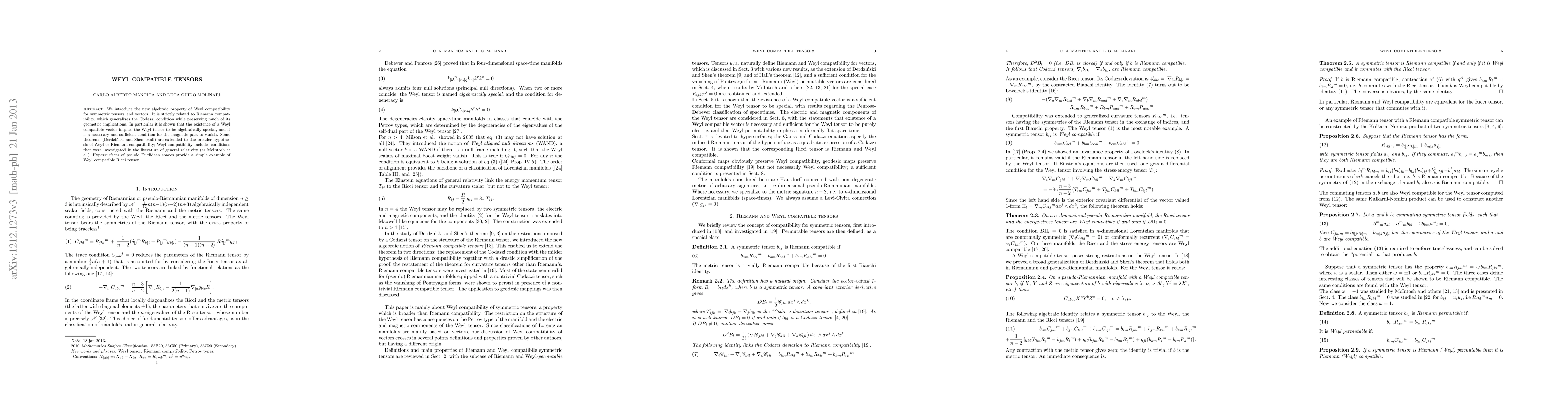 We introduce the new algebraic property of Weyl compatibility for symmetric tensors and vectors. It is strictly related to Riemann compatibility, which generalizes the Codazzi condition while preserving much of its geometric implications. In particular it is shown that the existence of a Weyl compatible vector implies the Weyl tensor to be algebraically special, and it is a necessary and sufficient condition for the magnetic part to vanish. Some theorems (Derdzinski and Shen, Hall) are extended to the broader hypothesis of Weyl or Riemann compatibility. Weyl compatibility includes conditions that were investigated in the literature of general relativity (as McIntosh et al.). Hypersurfaces of pseudo Euclidean spaces provide a simple example of Weyl compatible Ricci tensor.