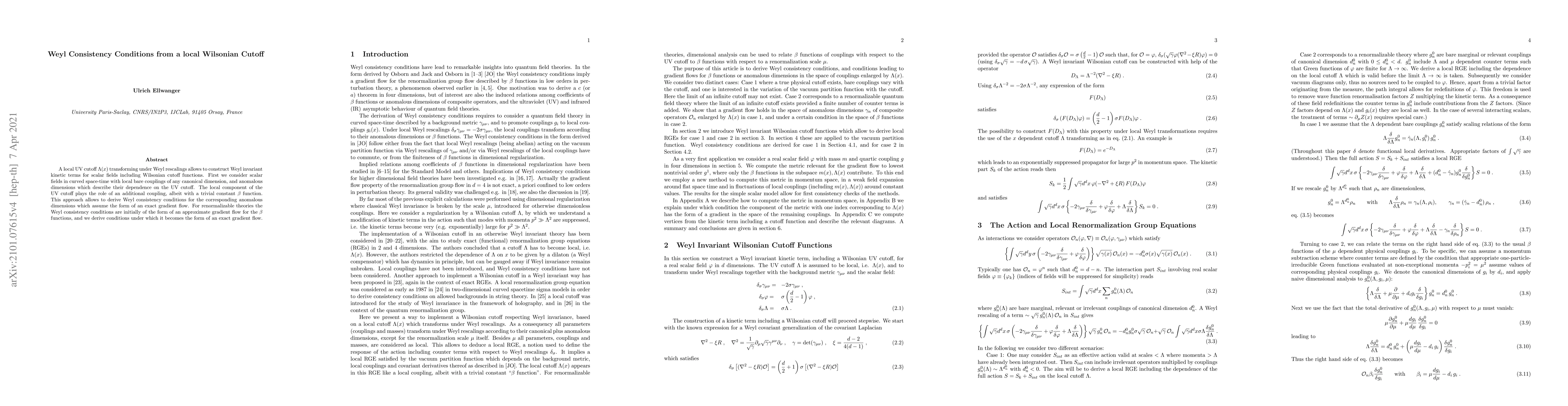 This paper constructs Weyl invariant kinetic terms for scalar fields using a local UV cutoff $\Lambda(x)$ that transforms under Weyl rescalings, incorporating Wilsonian cutoff functions. It derives Weyl consistency conditions for anomalous dimensions in the form of an exact gradient flow, transitioning from approximate to exact gradient flow for renormalizable theories under specific conditions.