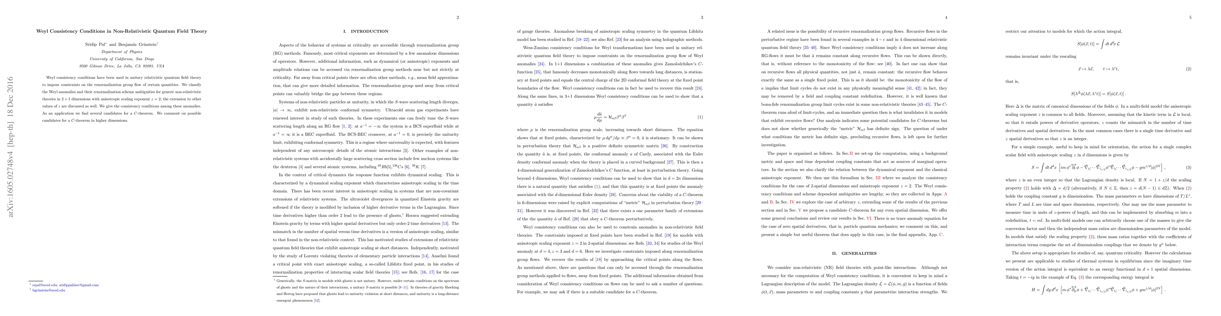 Weyl consistency conditions have been used in unitary relativistic quantum field theory to impose constraints on the renormalization group flow of certain quantities. We classify the Weyl anomalies and their renormalization scheme ambiguities for generic non-relativistic theories in 2+1 dimensions with anisotropic scaling exponent z=2; the extension to other values of z are discussed as well. We give the consistency conditions among these anomalies. As an application we find several candidates for a C-theorem. We comment on possible candidates for a $C$-theorem in higher dimensions.