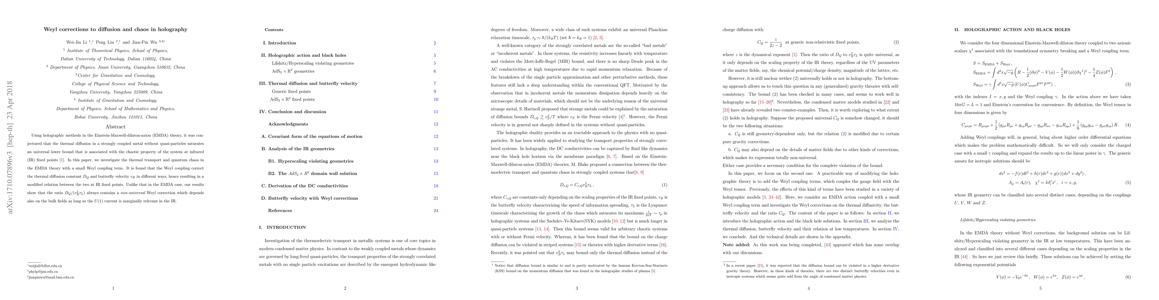 Using holographic methods in the Einstein-Maxwell-dilaton-axion (EMDA) theory, it was conjectured that the thermal diffusion in a strongly coupled metal without quasi-particles saturates an universal lower bound that is associated with the chaotic property of the system at infrared (IR) fixed points~\cite{blake:1705}. In this paper, we investigate the thermal transport and quantum chaos in the EMDA theory with a small Weyl coupling term. It is found that the Weyl coupling correct the thermal diffusion constant $D_Q$ and butterfly velocity $v_B$ in different ways, hence resulting a modified relation between the two at IR fixed points. Unlike that in the EMDA case, our results show that the ratio $D_Q/ (v_B^2\tau_L)$ always contains a {\it non-universal} Weyl correction which depends on the matter fields as long as the $U(1)$ current is relevant in the IR.