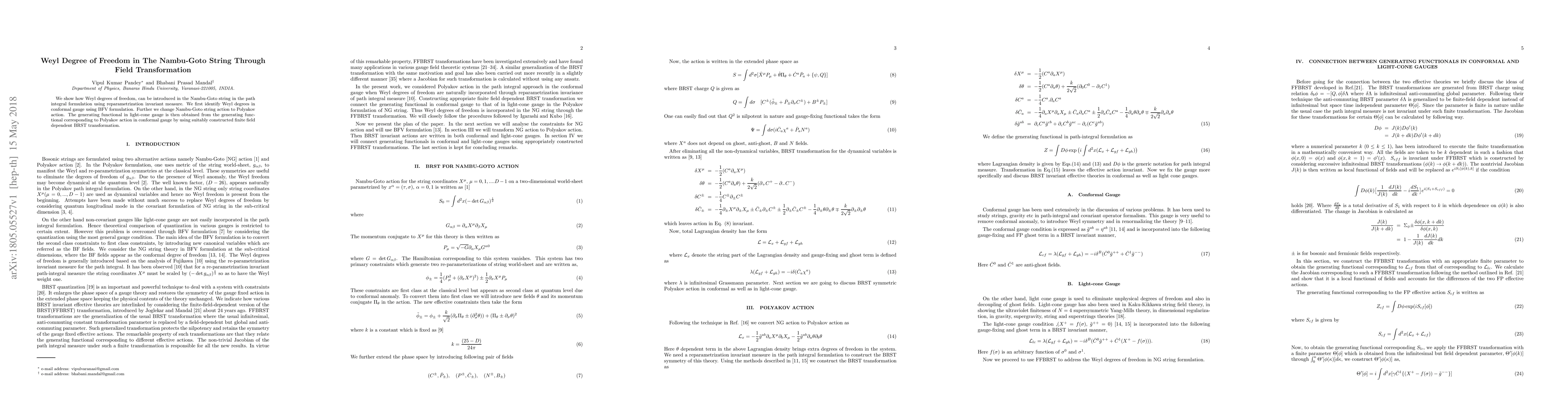 We show how Weyl degrees of freedom, can be introduced in the Nambu-Goto string in the path integral formulation using reparametrization invariant measure. We first identify Weyl degrees in conformal gauge using BFV formulation. Further we change Nambu-Goto string action to Polyakov action. The generating functional in light-cone gauge is then obtained from the generating func- tional corresponding to Polyakov action in conformal gauge by using suitably constructed finite field dependent BRST transformation.