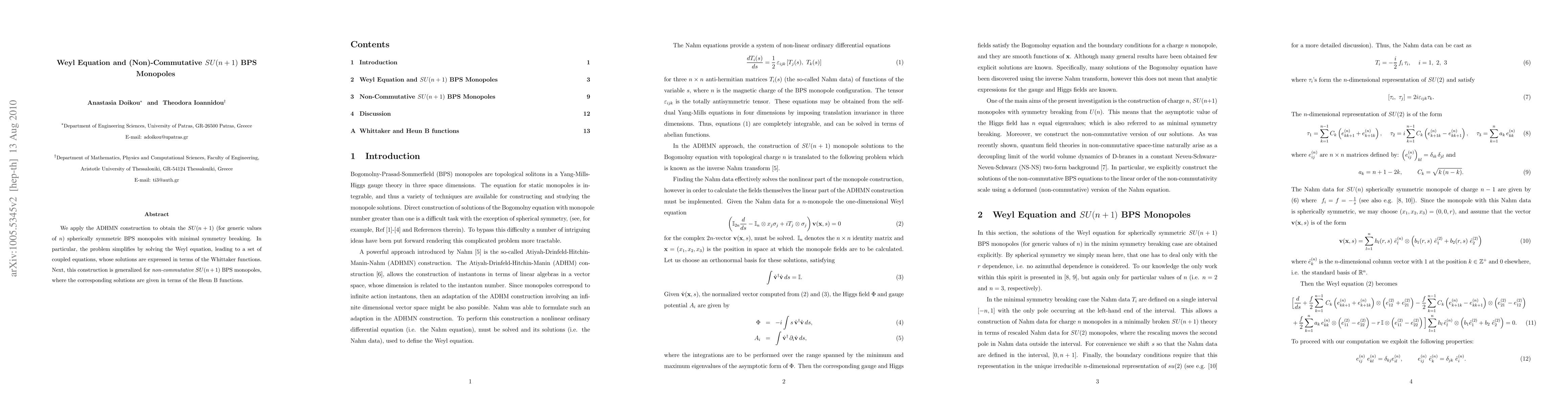 This paper uses the ADHMN construction to derive SU(n+1) spherically symmetric BPS monopoles by solving the Weyl equation and expressing solutions with Whittaker functions. It further extends the results to non-commutative SU(n+1) BPS monopoles, represented by Heun B functions.