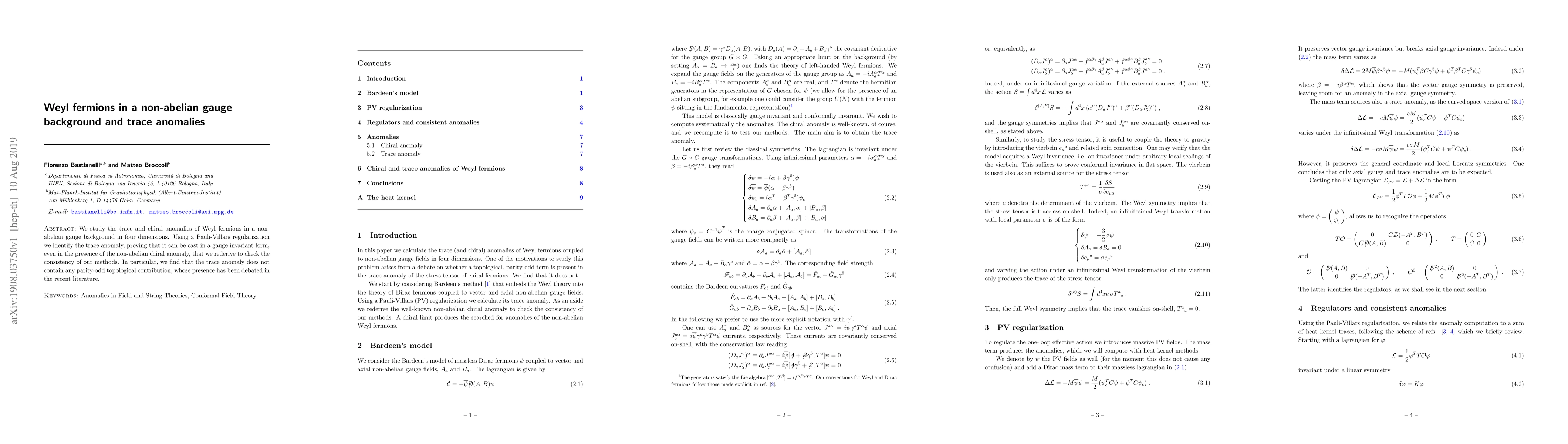 This paper investigates Weyl fermions' trace and chiral anomalies in a four-dimensional non-abelian gauge background, demonstrating gauge invariance of the trace anomaly despite the presence of a non-abelian chiral anomaly. The study confirms that the trace anomaly lacks any parity-odd topological contributions, resolving recent debates on this issue.
