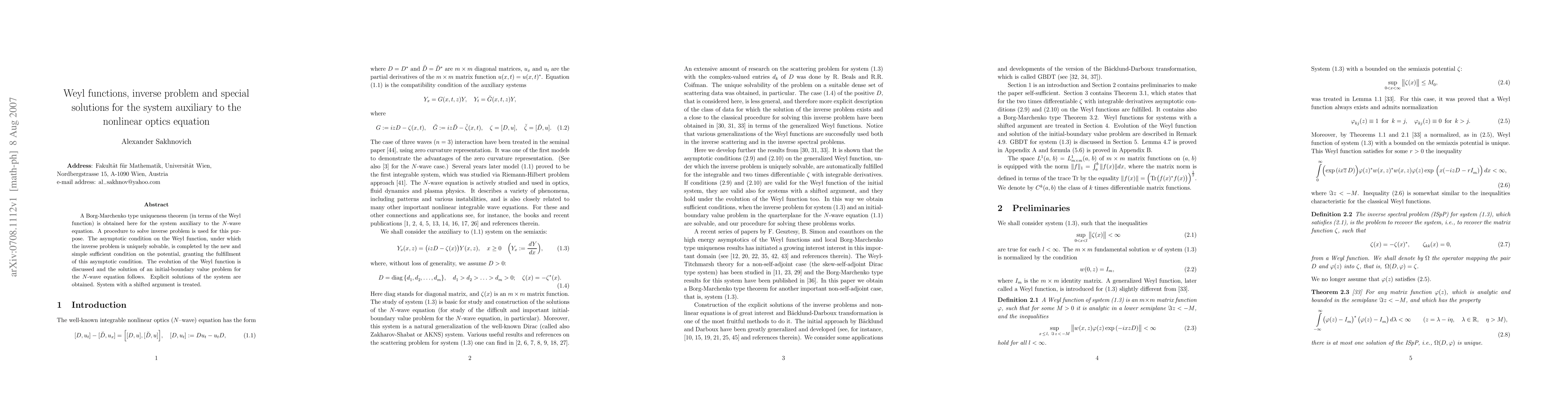 Researchers developed a theorem using Weyl functions to solve an inverse problem for a nonlinear optics equation, obtaining explicit solutions and discussing the evolution of the function.
