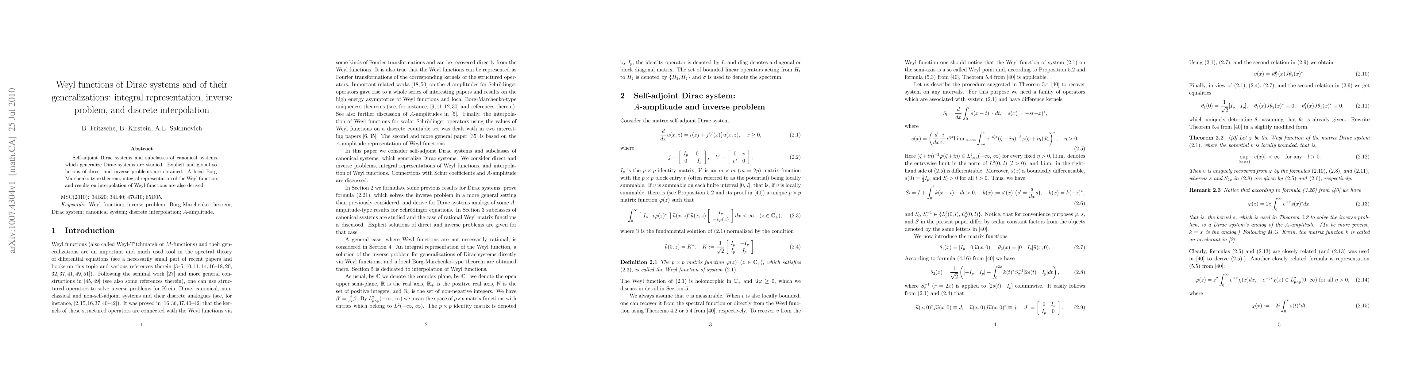 Self-adjoint Dirac systems and subclasses of canonical systems, which generalize Dirac systems are studied. Explicit and global solutions of direct and inverse problems are obtained. A local Borg-Marchenko-type theorem, integral representation of the Weyl function, and results on interpolation of Weyl functions are also derived.