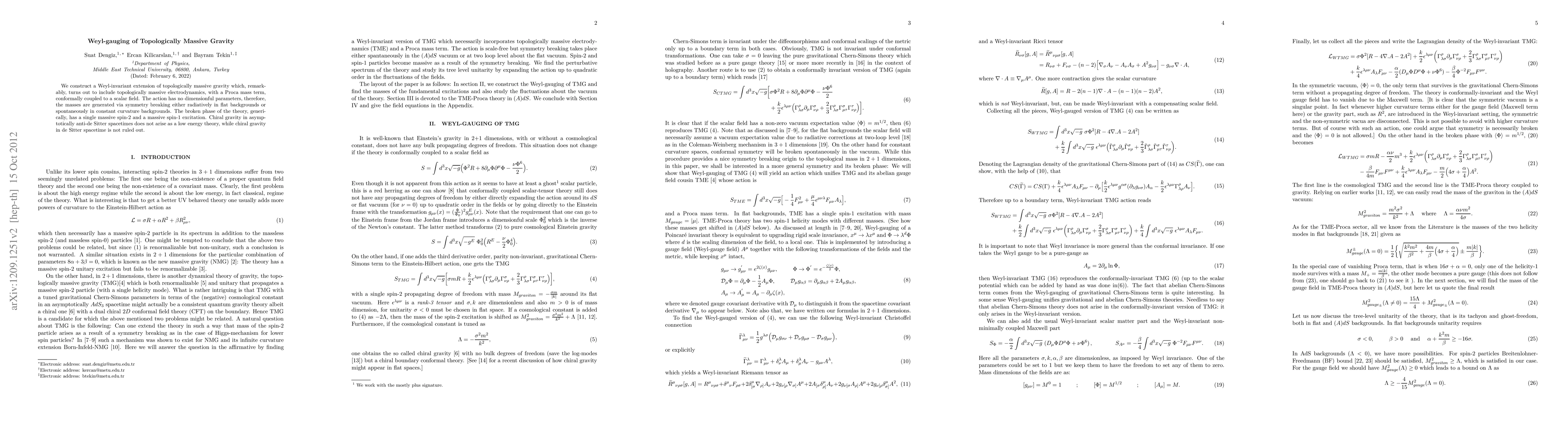 We construct a Weyl-invariant extension of topologically massive gravity which, remarkably, turns out to include topologically massive electrodynamics, with a Proca mass term, conformally coupled to a scalar field. The action has no dimensionful parameters, therefore, the masses are generated via symmetry breaking either radiatively in flat backgrounds or spontaneously in constant curvature backgrounds. The broken phase of the theory, generically, has a single massive spin-2 and a massive spin-1 excitation. Chiral gravity in asymptotically anti-de Sitter spacetimes does not arise as a low energy theory, while chiral gravity in de Sitter spacetime is not ruled out.