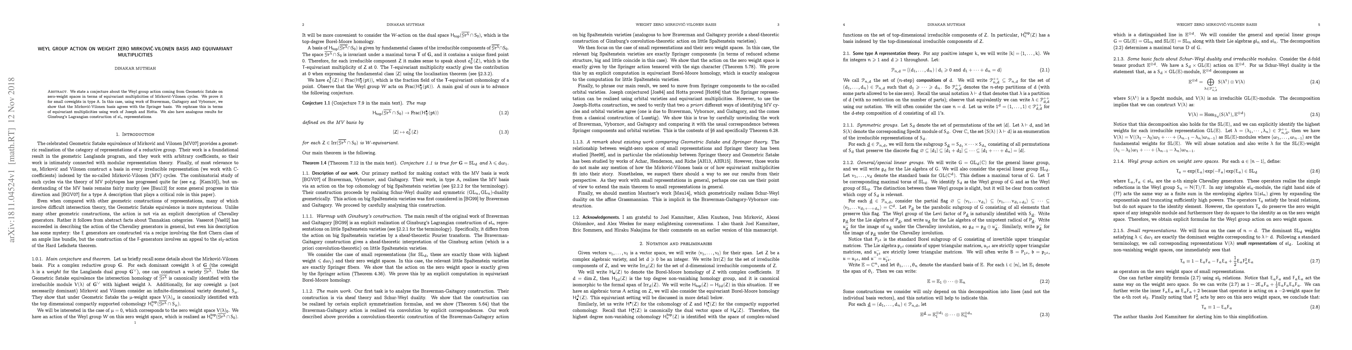 We state a conjecture about the Weyl group action coming from Geometric Satake on zero-weight spaces in terms of equivariant multiplicities of Mirkovi\'c-Vilonen cycles. We prove it for small coweights in type A. In this case, using work of Braverman, Gaitsgory and Vybornov, we show that the Mirkovi\'c-Vilonen basis agrees with the Springer basis. We rephrase this in terms of equivariant multiplicities using work of Joseph and Hotta. We also have analogous results for Ginzburg's Lagrangian construction of $\mathfrak{sl}_n$ representations.