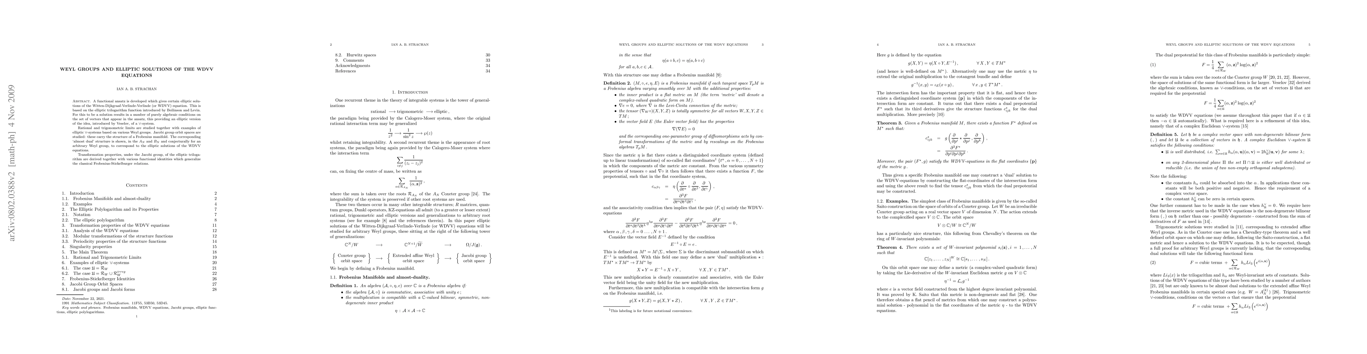 A functional ansatz is developed which gives certain elliptic solutions of the Witten-Dijkgraaf-Verlinde-Verlinde (or WDVV) equation. This is based on the elliptic trilogarithm function introduced by Beilinson and Levin. For this to be a solution results in a number of purely algebraic conditions on the set of vectors that appear in the ansatz, this providing an elliptic version of the idea, introduced by Veselov, of a V-system. Rational and trigonometric limits are studied together with examples of elliptic V-systems based on various Weyl groups. Jacobi group orbit spaces are studied: these carry the structure of a Frobenius manifold. The corresponding almost dual structure is shown, in the A_N and B_N and conjecturally for an arbitrary Weyl group, to correspond to the elliptic solutions of the WDVV equations. Transformation properties, under the Jacobi group, of the elliptic trilogarithm are derived together with various functional identities which generalize the classical Frobenius-Stickelburger relations.