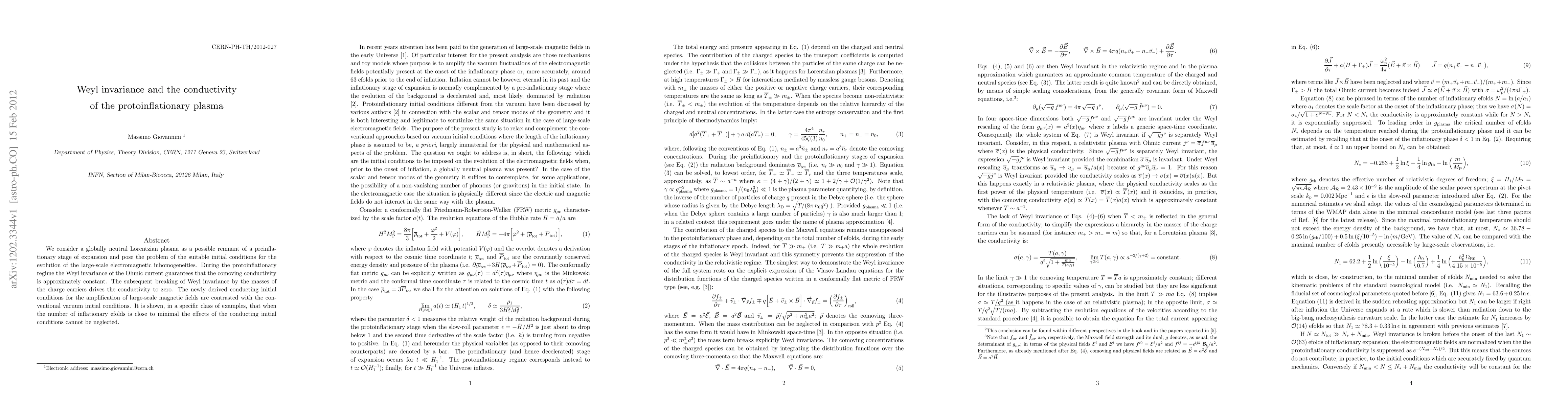 This paper investigates the conductivity of a globally neutral Lorentzian plasma during the protoinflationary stage, showing that Weyl invariance maintains constant conductivity. The breaking of this invariance due to charge carrier masses reduces conductivity to zero, highlighting the importance of conducting initial conditions for amplifying large-scale magnetic fields, especially when the number of inflationary efolds is near minimal.