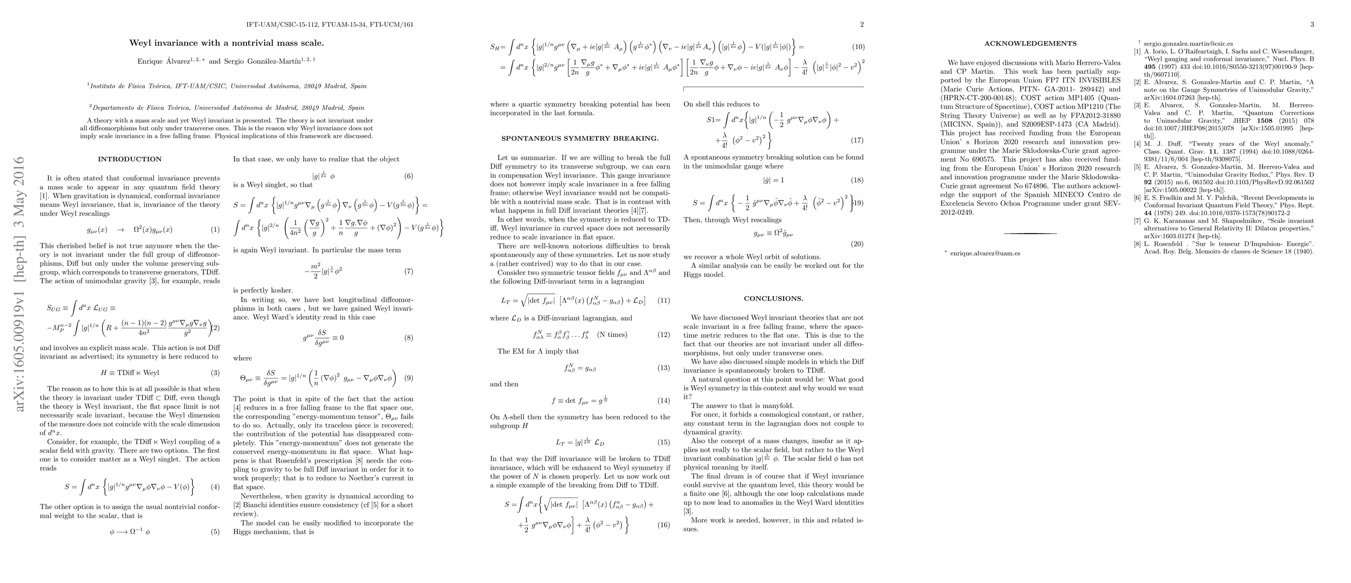 This paper introduces a Weyl invariant theory with a nontrivial mass scale, which is only invariant under transverse diffeomorphisms, thus not implying scale invariance. The physical implications of this framework are explored.