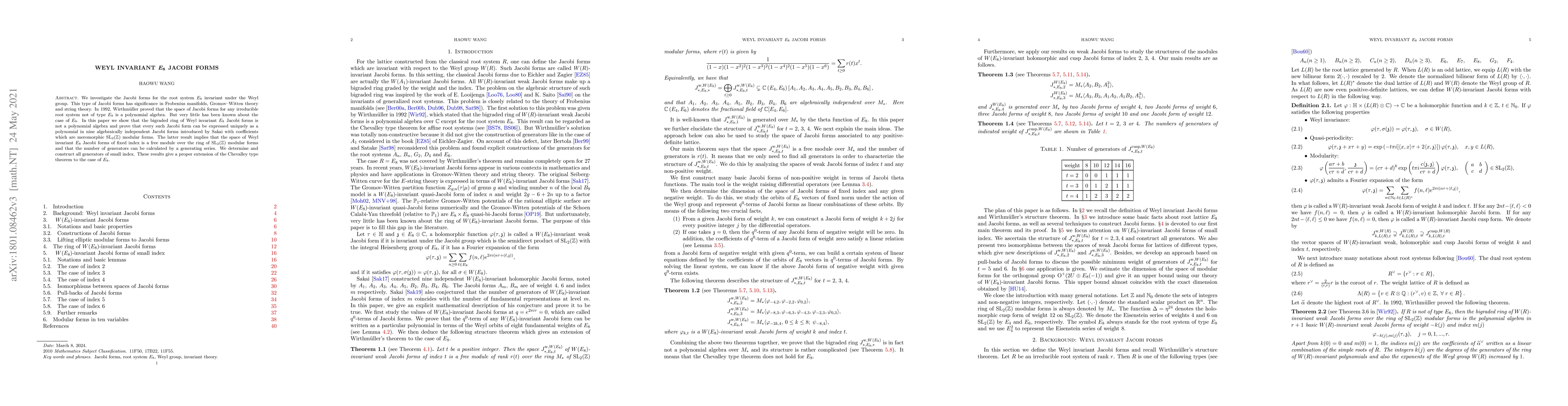 We investigate the Jacobi forms for the root system $E_8$ invariant under the Weyl group. This type of Jacobi forms has significance in Frobenius manifolds, Gromov--Witten theory and string theory. In 1992, Wirthm\"{u}ller proved that the space of Jacobi forms for any irreducible root system not of type $E_8$ is a polynomial algebra. But very little has been known about the case of $E_8$. In this paper we show that the bigraded ring of Weyl invariant $E_8$ Jacobi forms is not a polynomial algebra and prove that every such Jacobi form can be expressed uniquely as a polynomial in nine algebraically independent Jacobi forms introduced by Sakai with coefficients which are meromorphic SL(2,Z) modular forms. The latter result implies that the space of Weyl invariant $E_8$ Jacobi forms of fixed index is a free module over the ring of SL(2,Z) modular forms and that the number of generators can be calculated by a generating series. We determine and construct all generators of small index. These results give a proper extension of the Chevalley type theorem to the case of $E_8$.