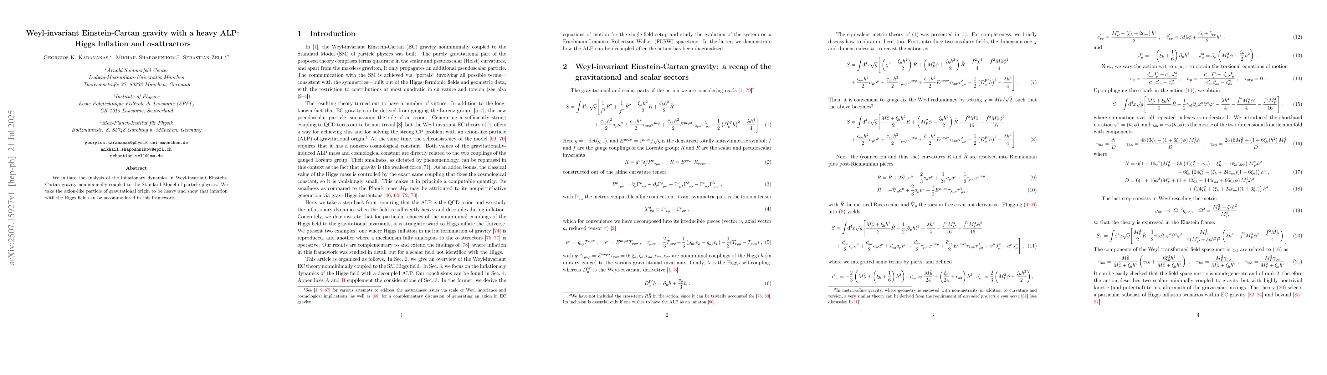 This paper explores inflationary dynamics in Weyl-invariant Einstein-Cartan gravity, coupled with the Standard Model, featuring a heavy axion-like particle (ALP). It demonstrates that Higgs field-driven inflation is feasible in this setup, presenting a novel approach to understanding early universe inflation and particle physics.